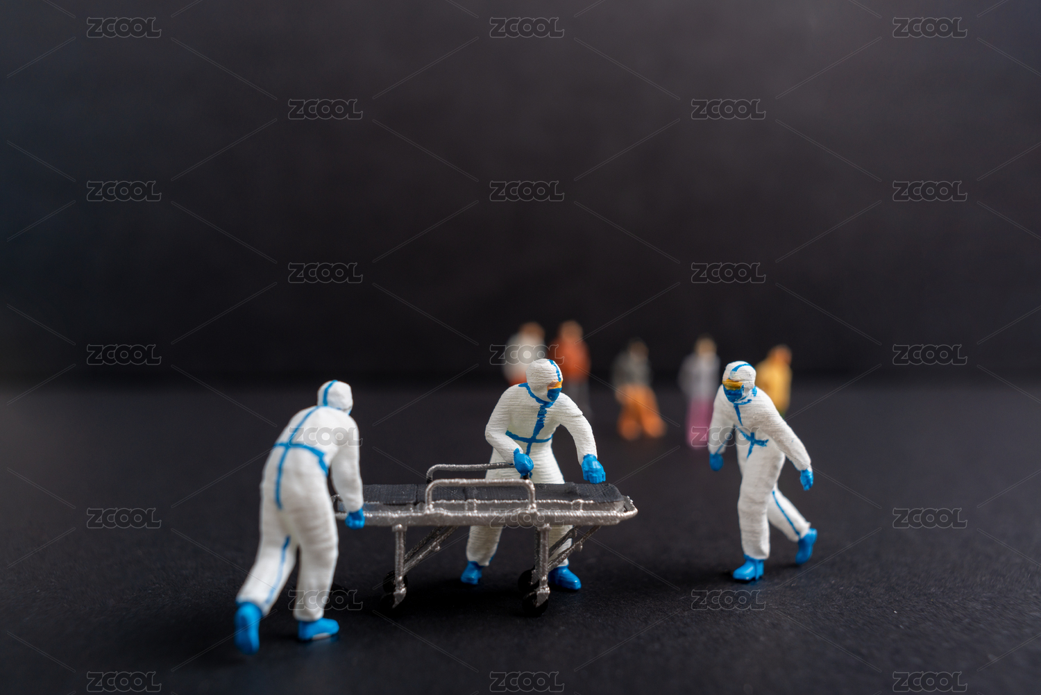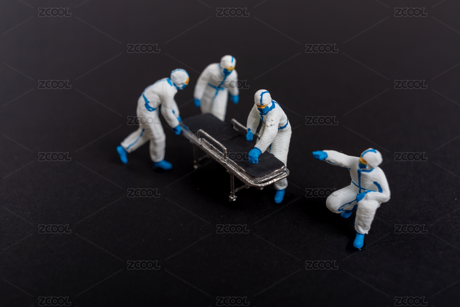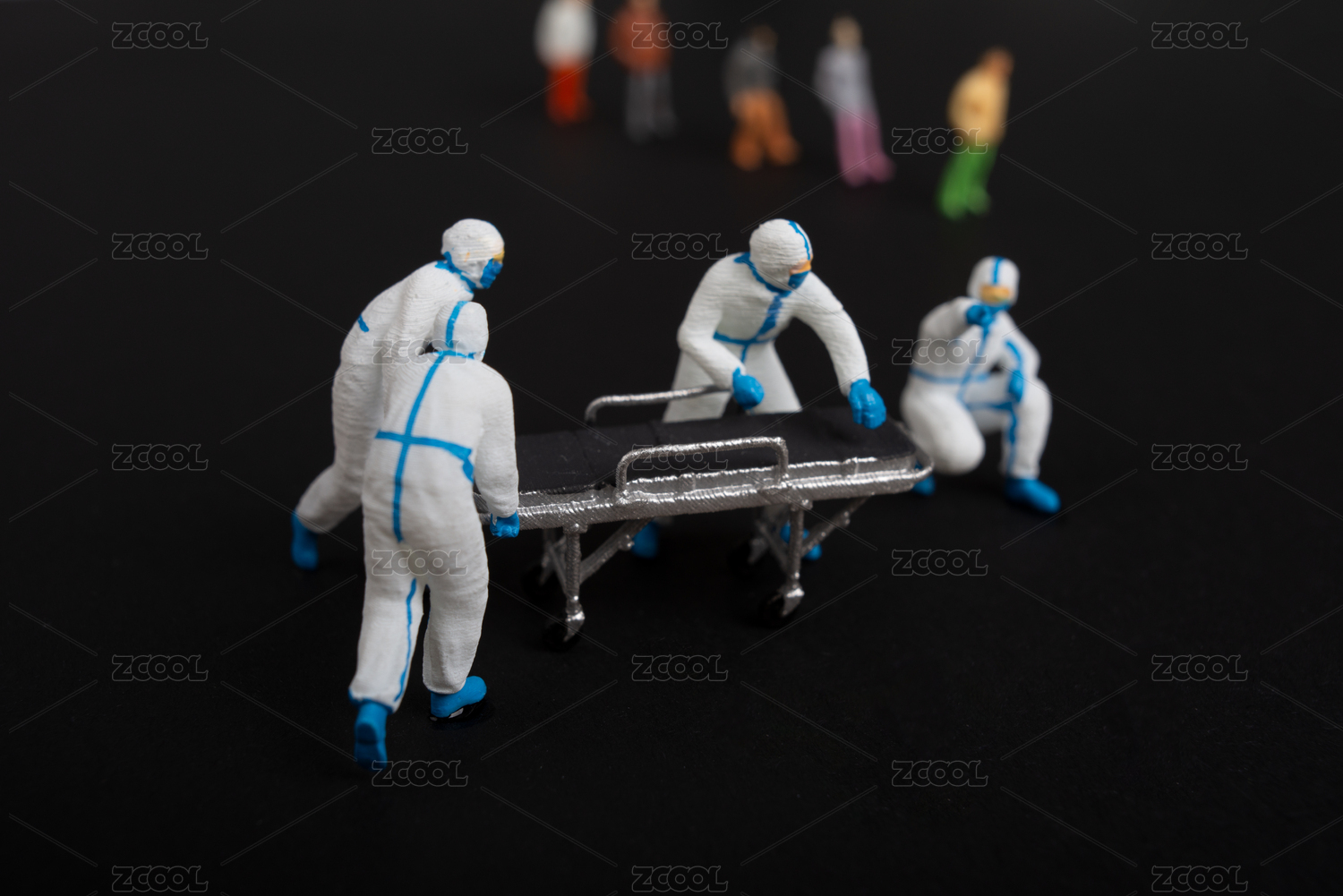 四名穿防護服推擔(dān)架車的醫(yī)生工作者