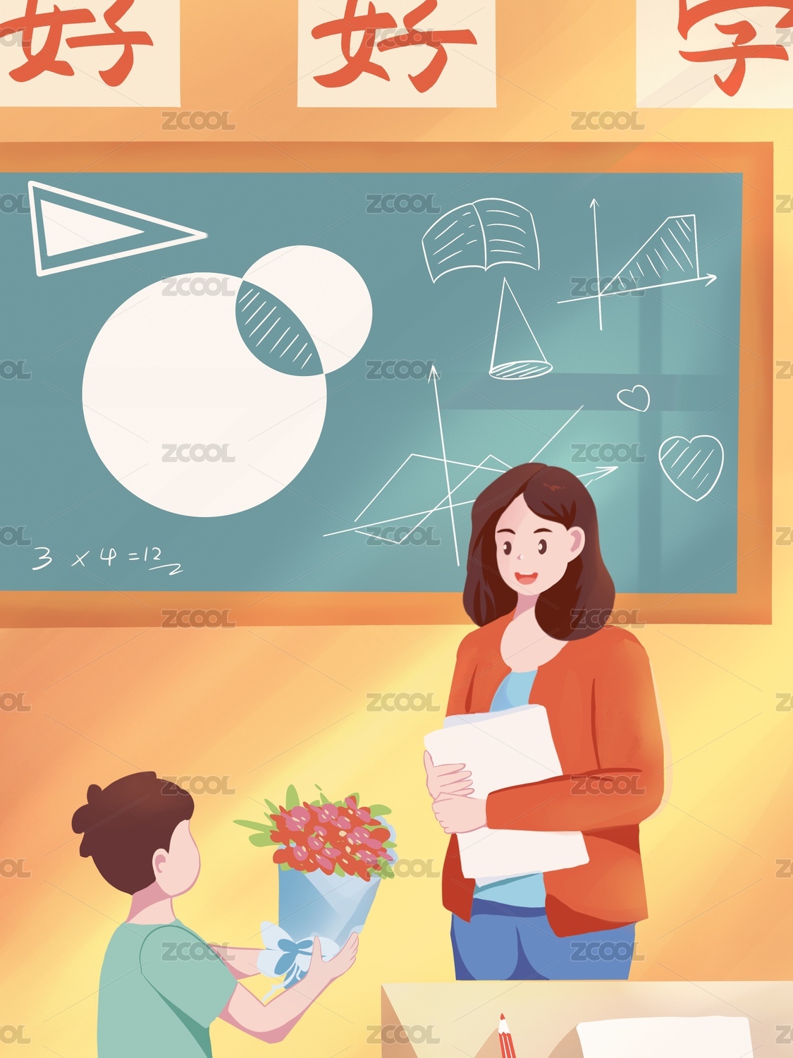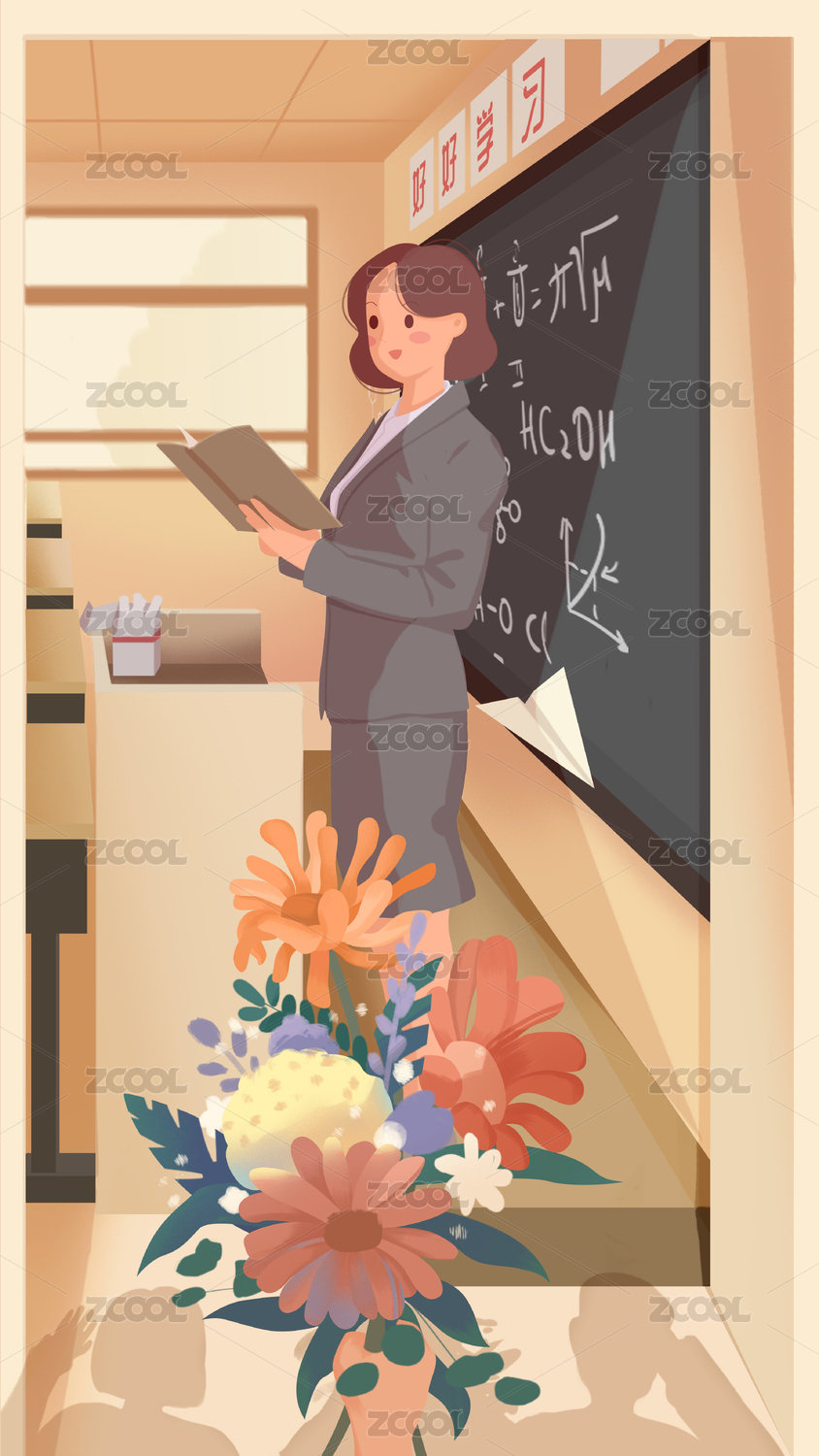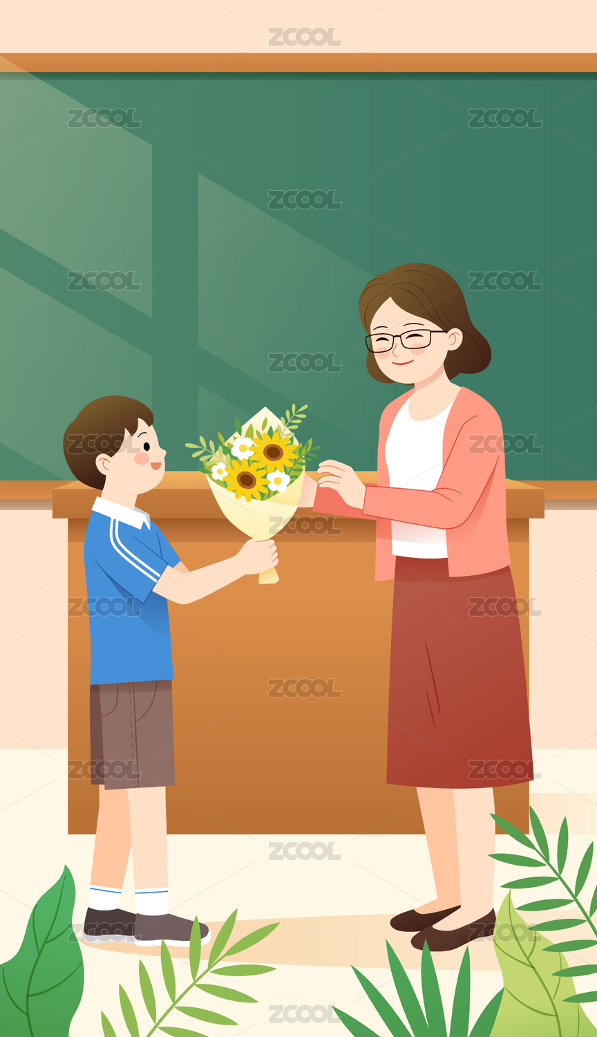 學生向老師獻花感謝師恩教師節(jié)手繪插畫