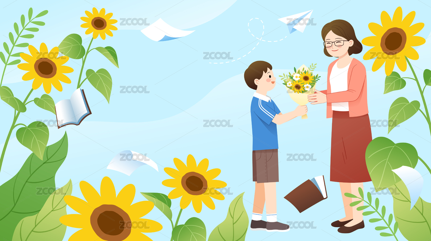 一名學生給老師獻花和向日葵背景橫版