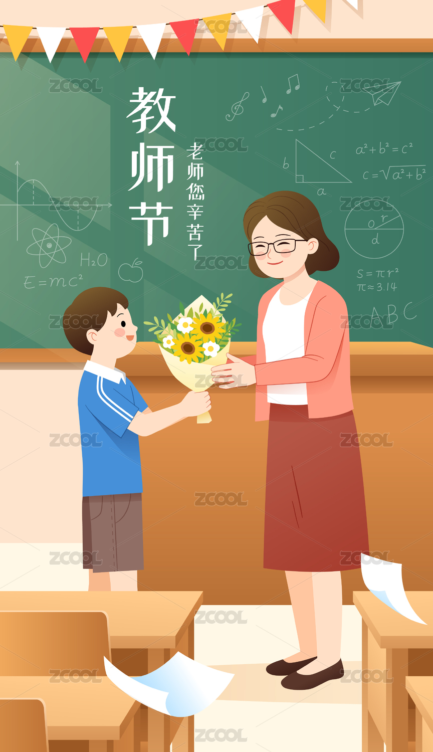教師節(jié)學生向老師獻花矢量分層插畫