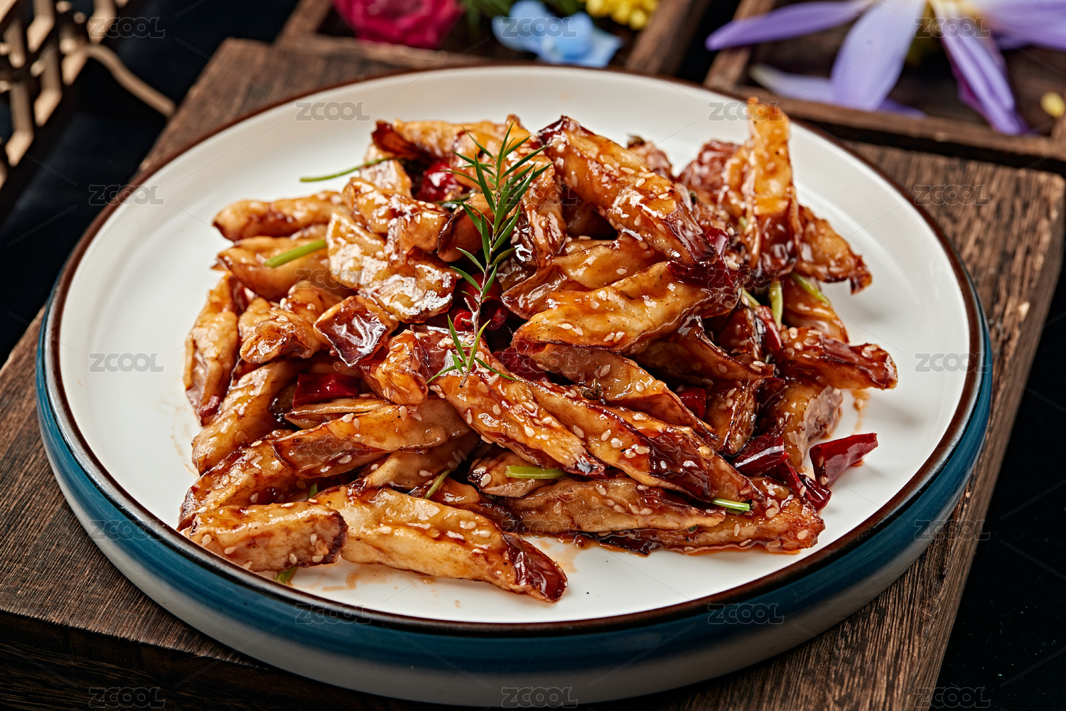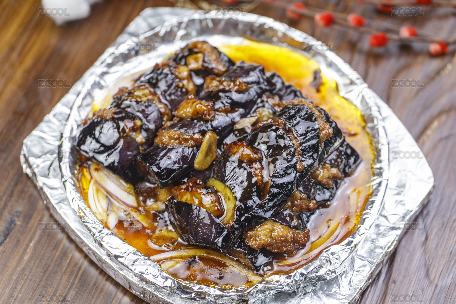 創(chuàng)意菜鐵板茄子放在木桌上
