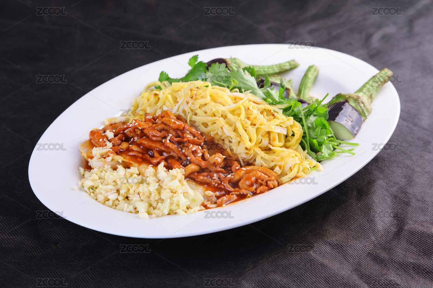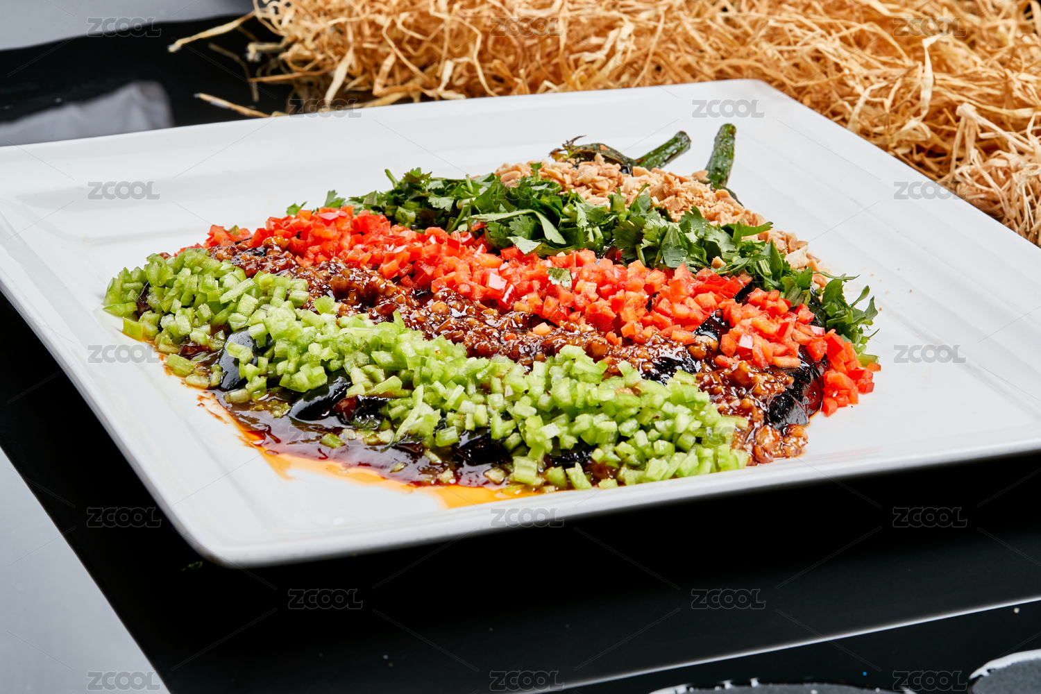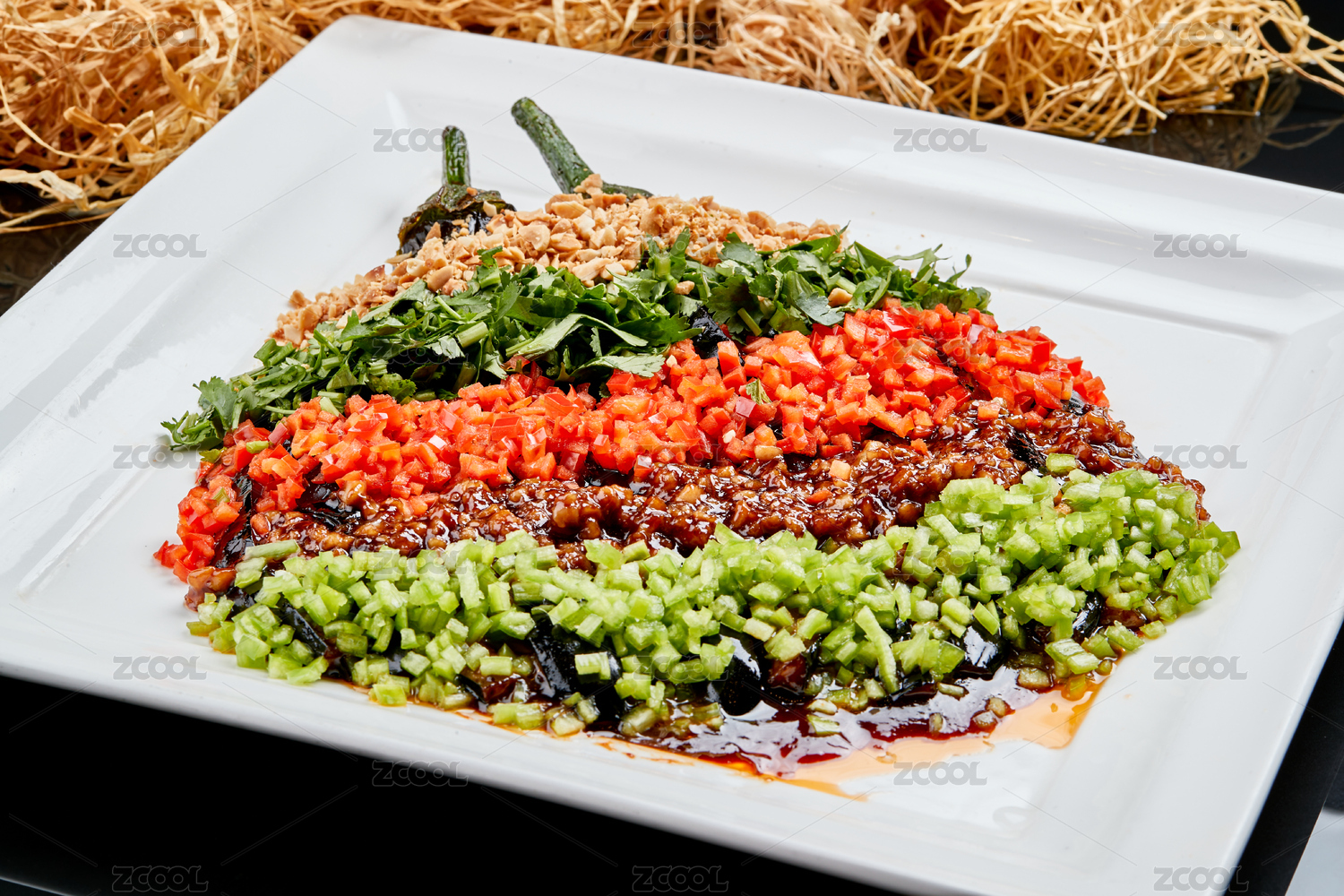 白色瓷盤裝的醬香五色蒜泥茄子