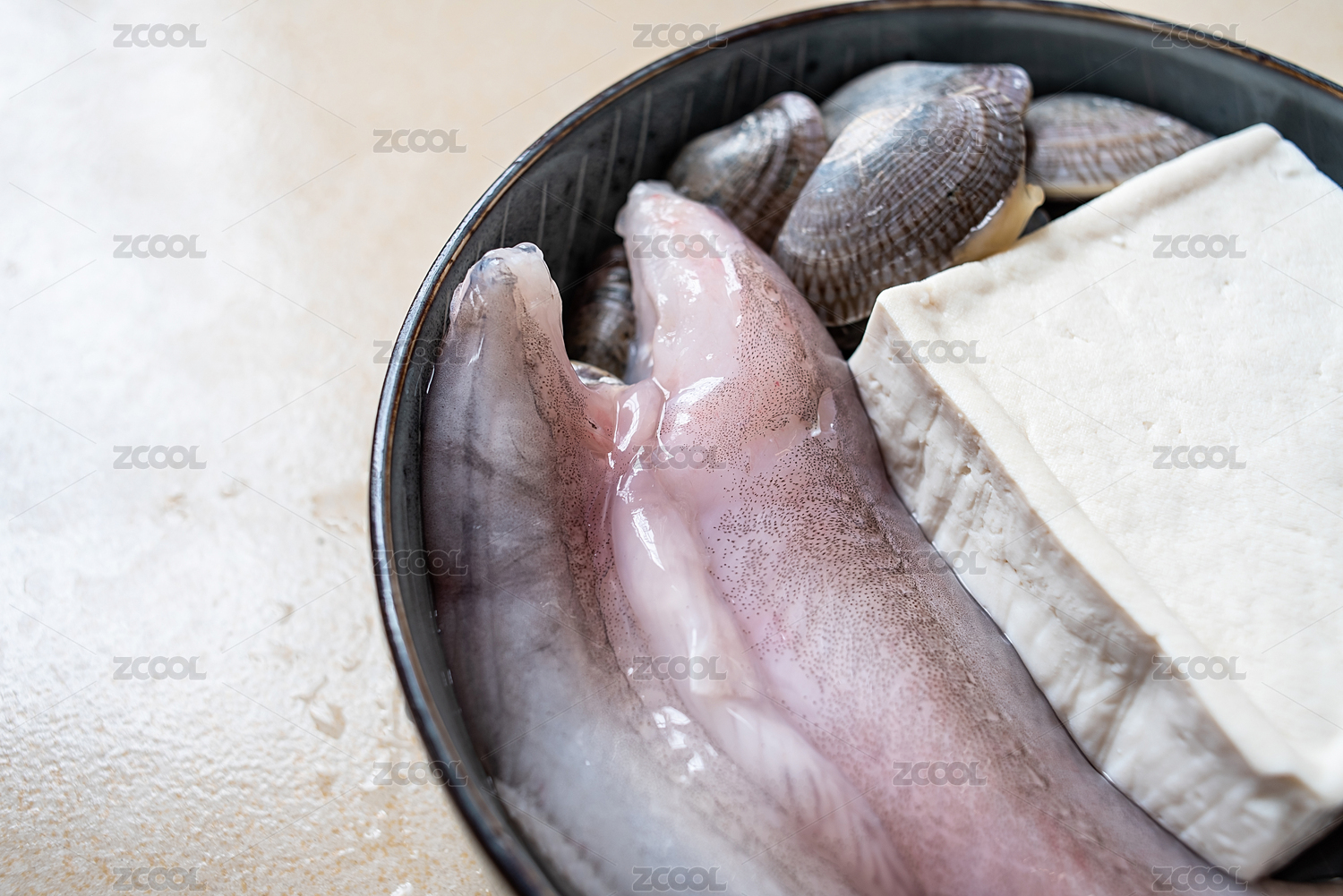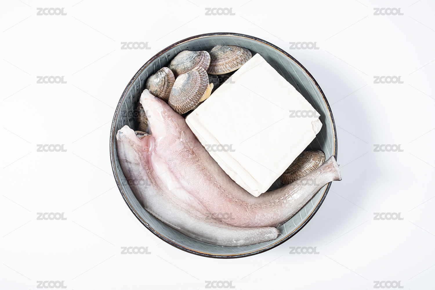 一碗準(zhǔn)備做湯的新鮮食材龍頭魚花蛤和豆腐