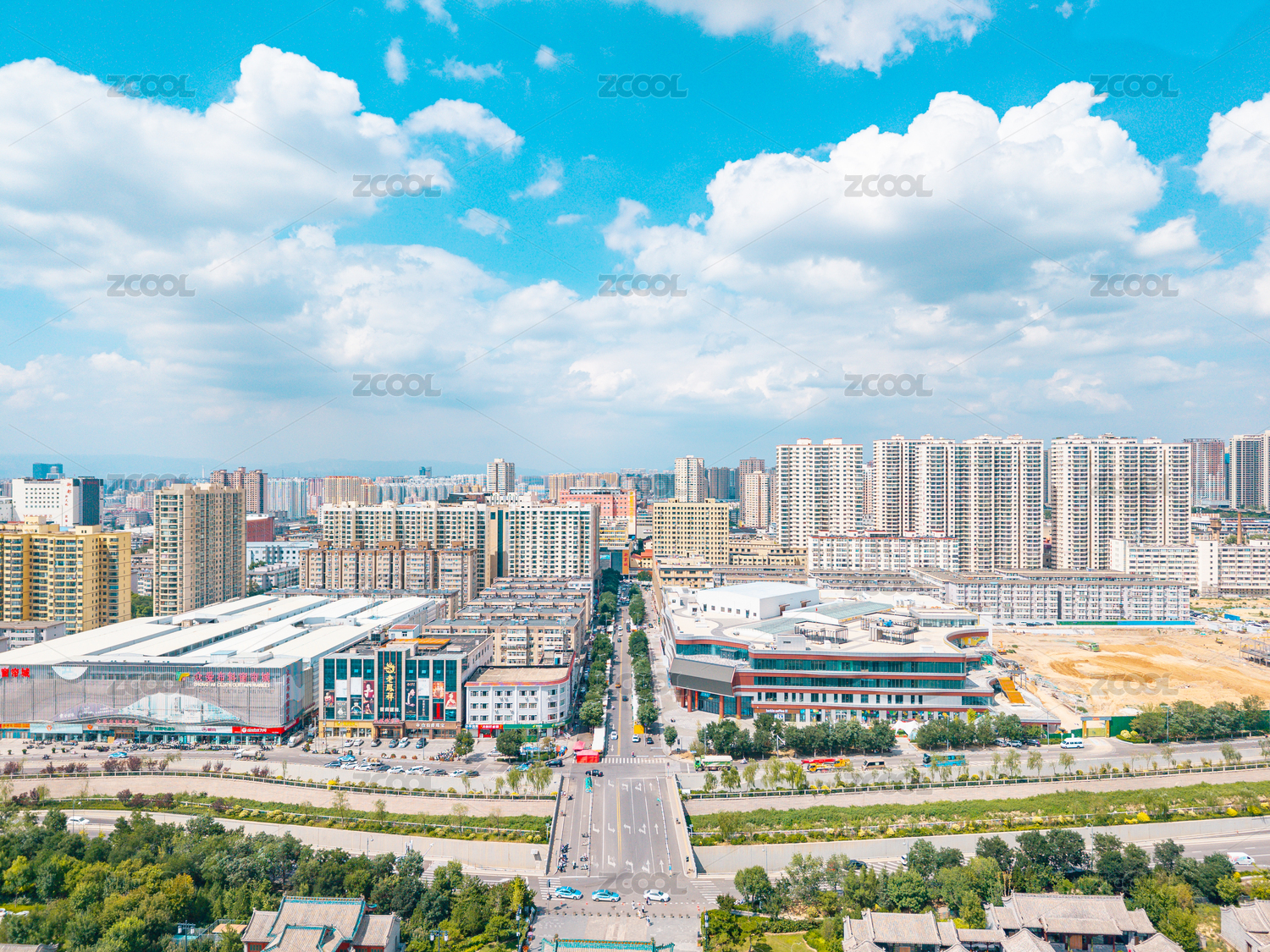 航拍藍(lán)天白云下的太原城市建筑群