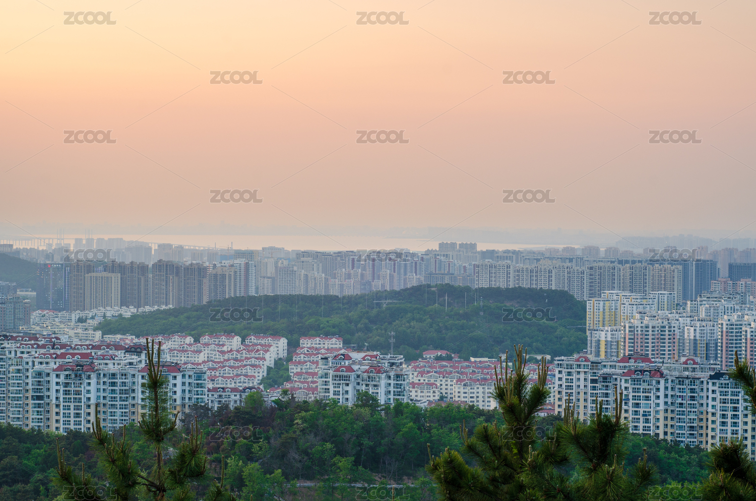 青島浮山香苑城市建筑群與山林日落景觀