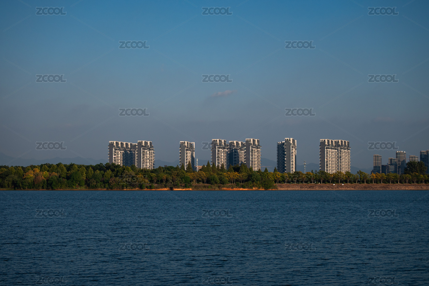 中國(guó)浙江金華義烏植物園湖岸遠(yuǎn)眺現(xiàn)代建筑群