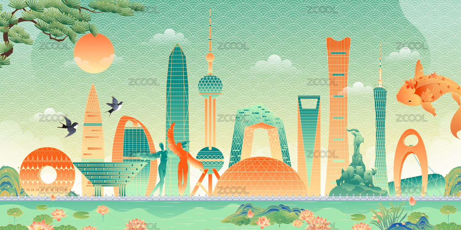 中國(guó)城市地標(biāo)建筑群插畫(huà)