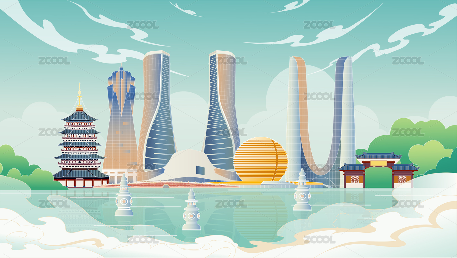 杭州地標(biāo)建筑群矢量插畫(huà)