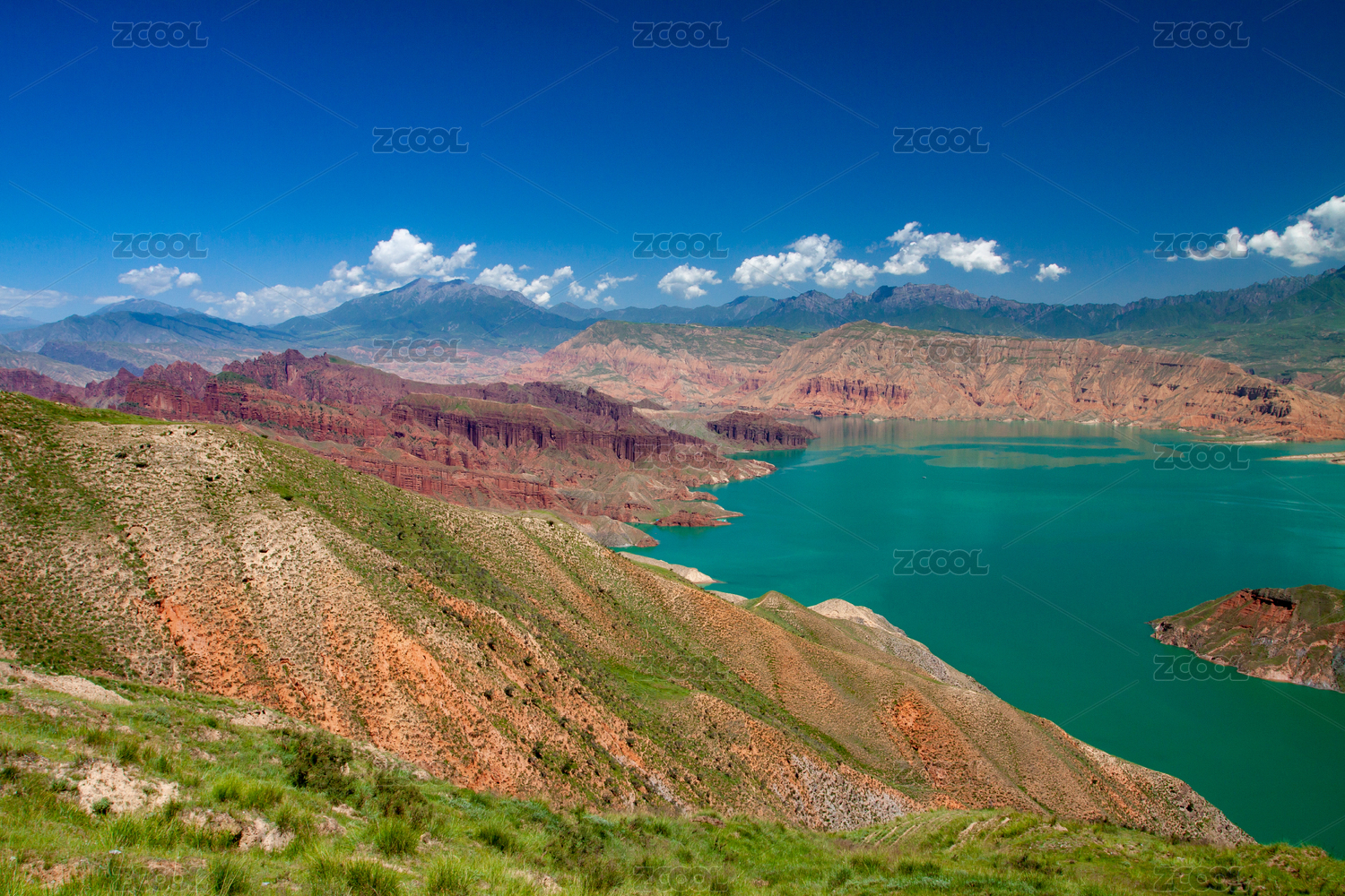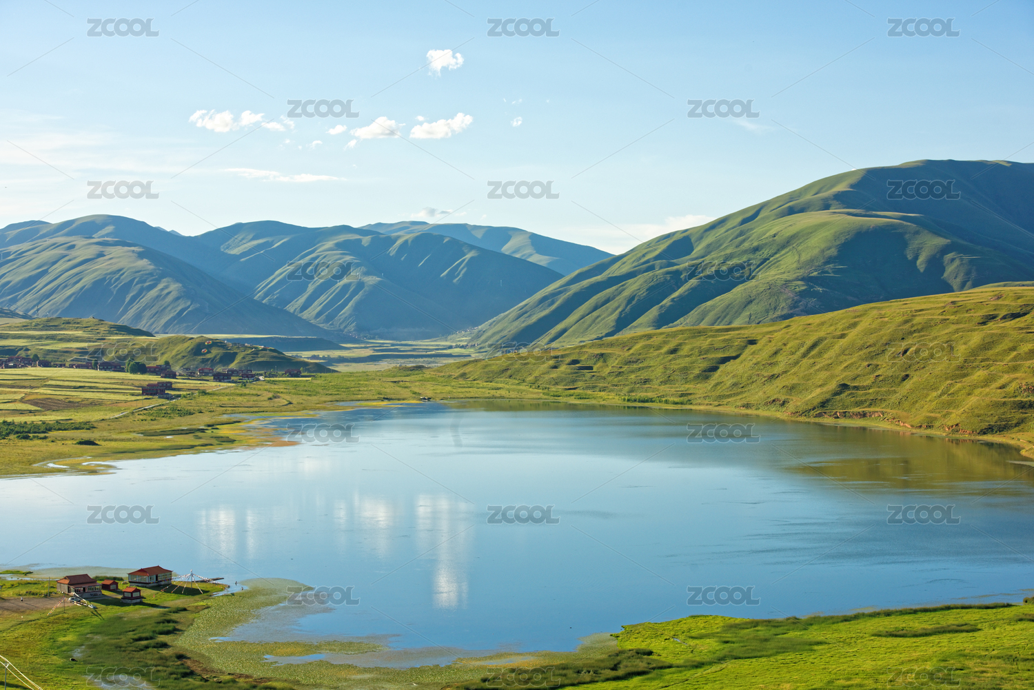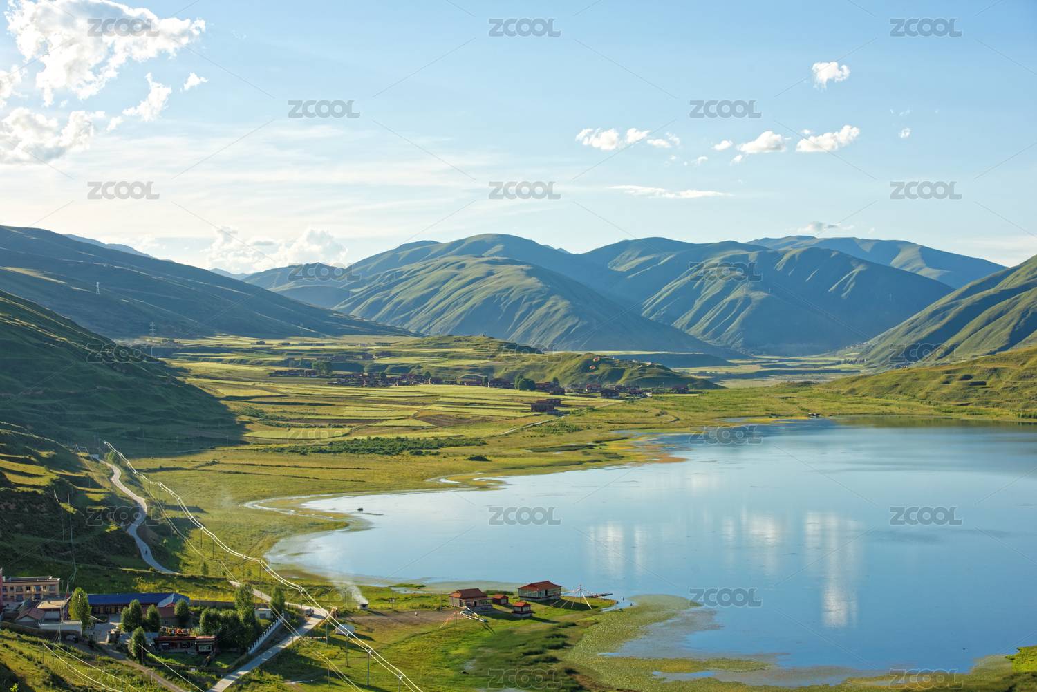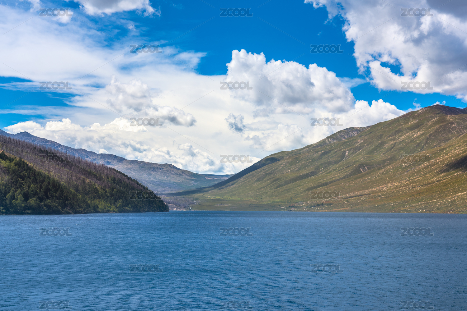 中國西藏高原湖泊青山綠山藍(lán)天白云遠(yuǎn)景