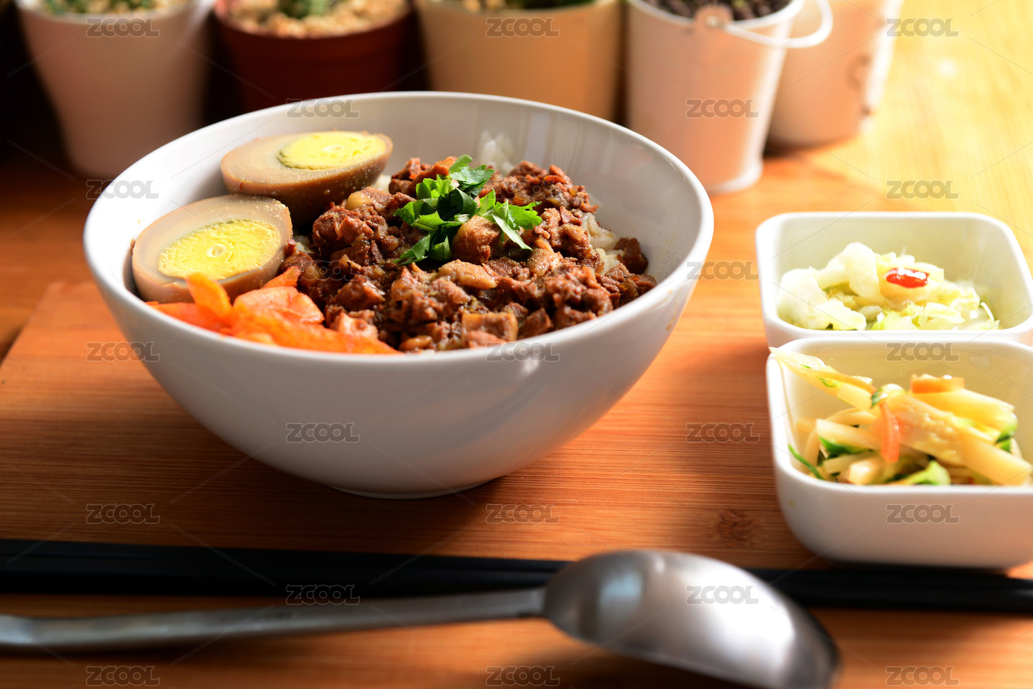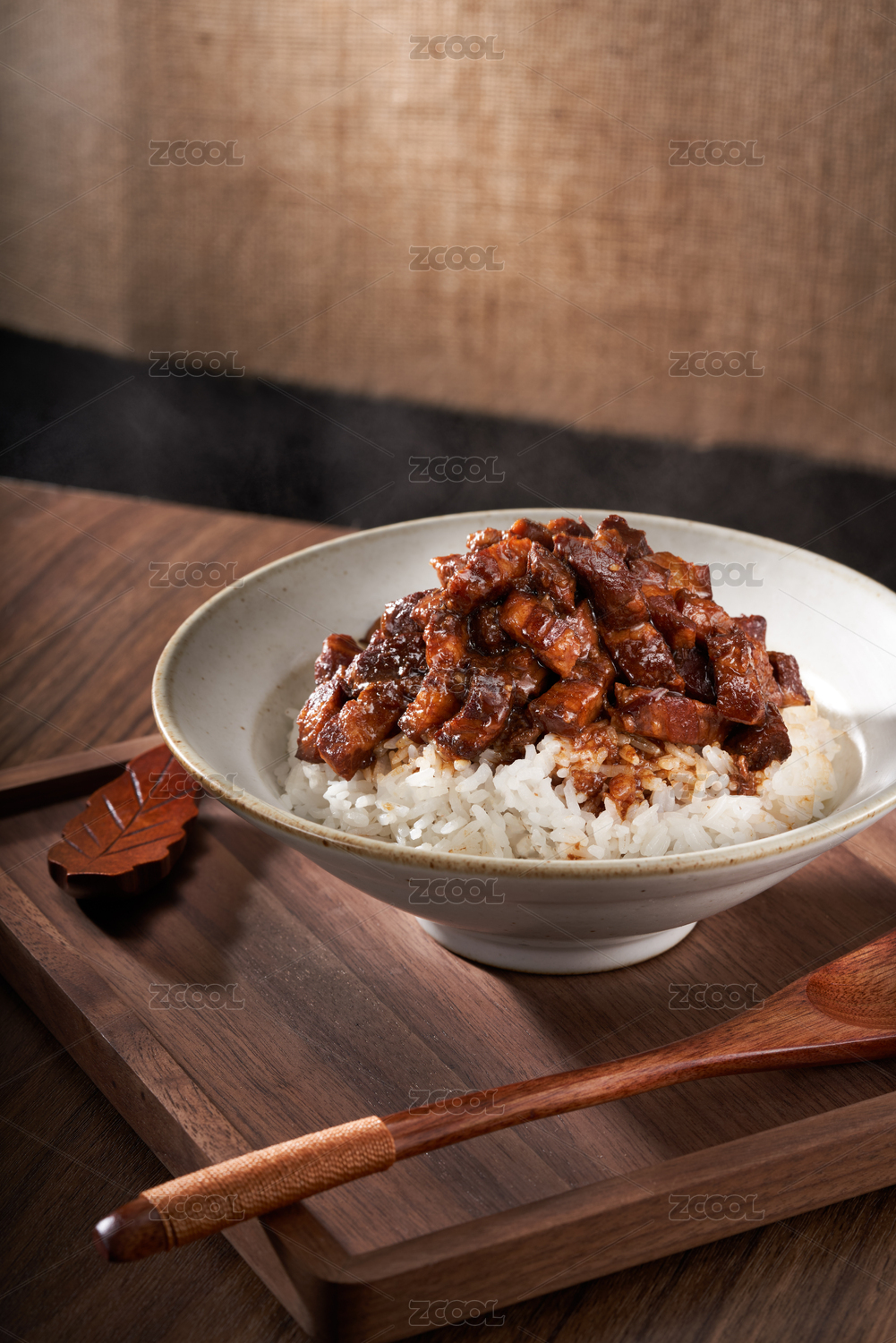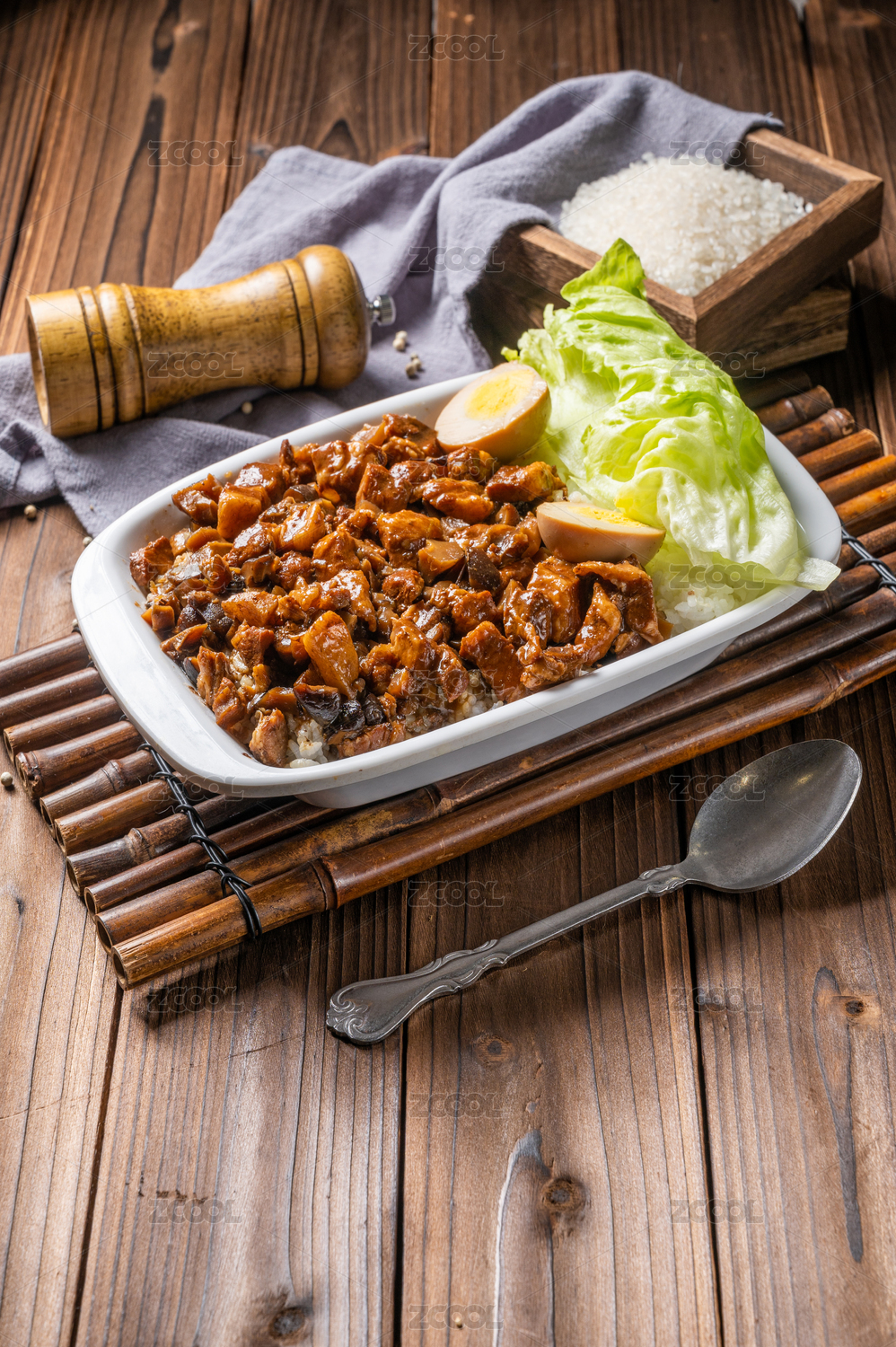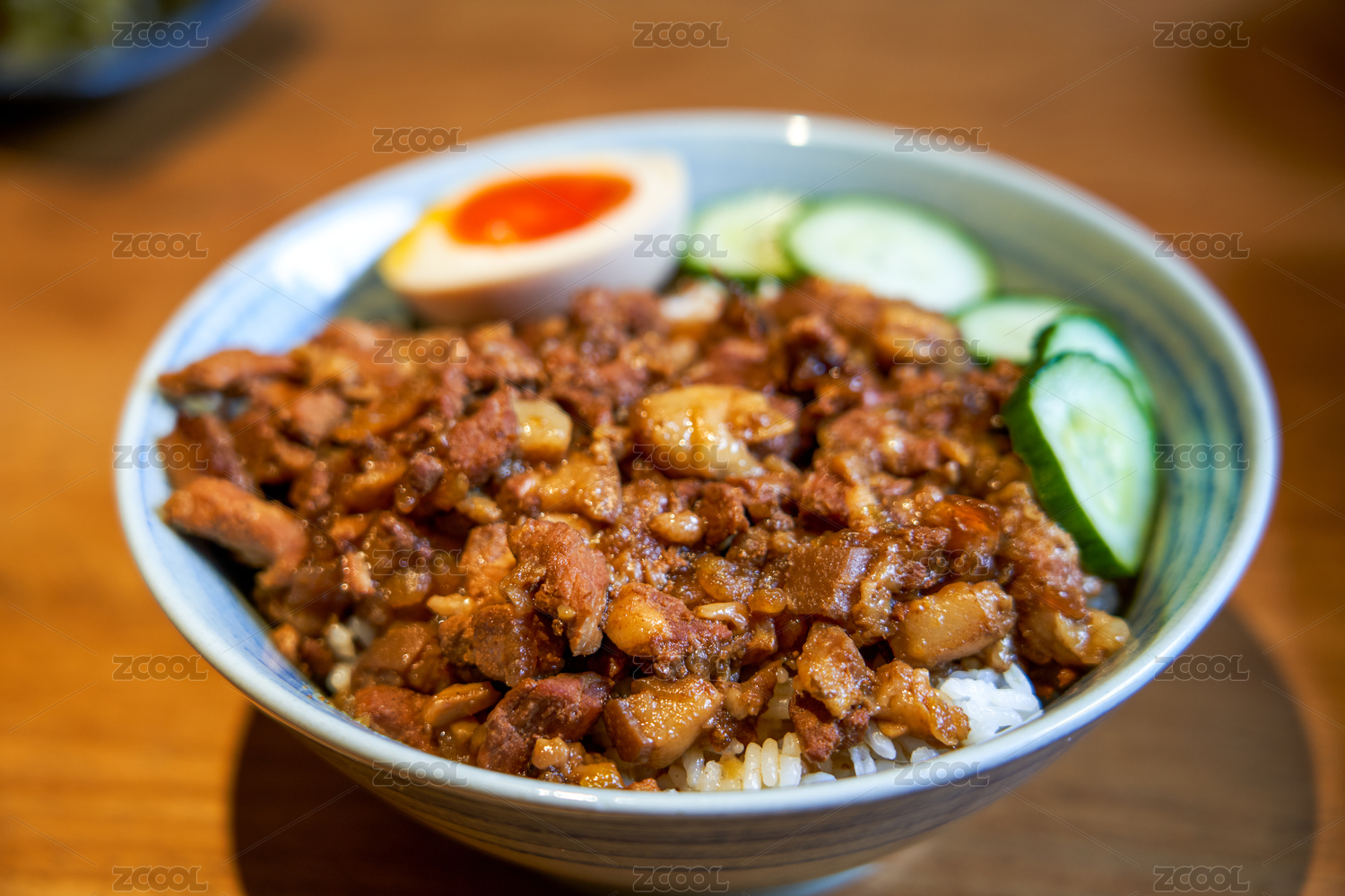 白色背景木紋底的一碗臺(tái)灣鹵肉飯?zhí)貙?/div>