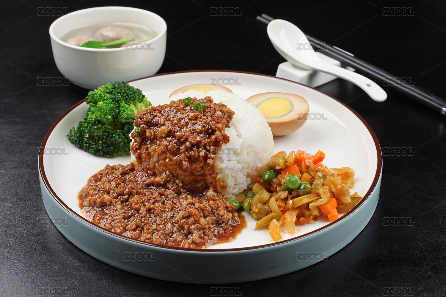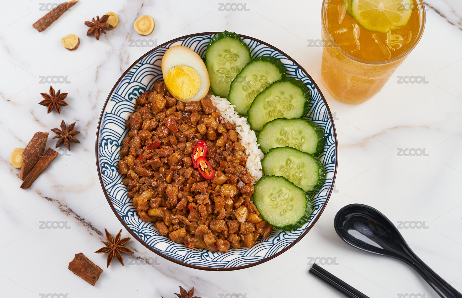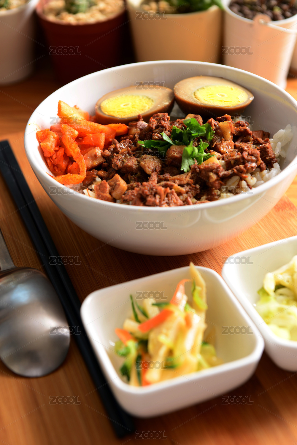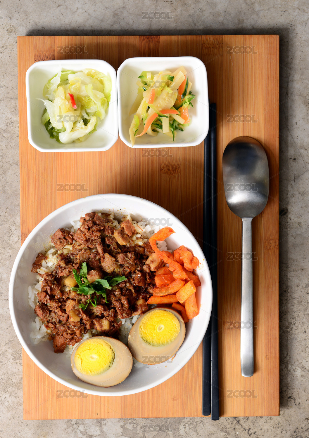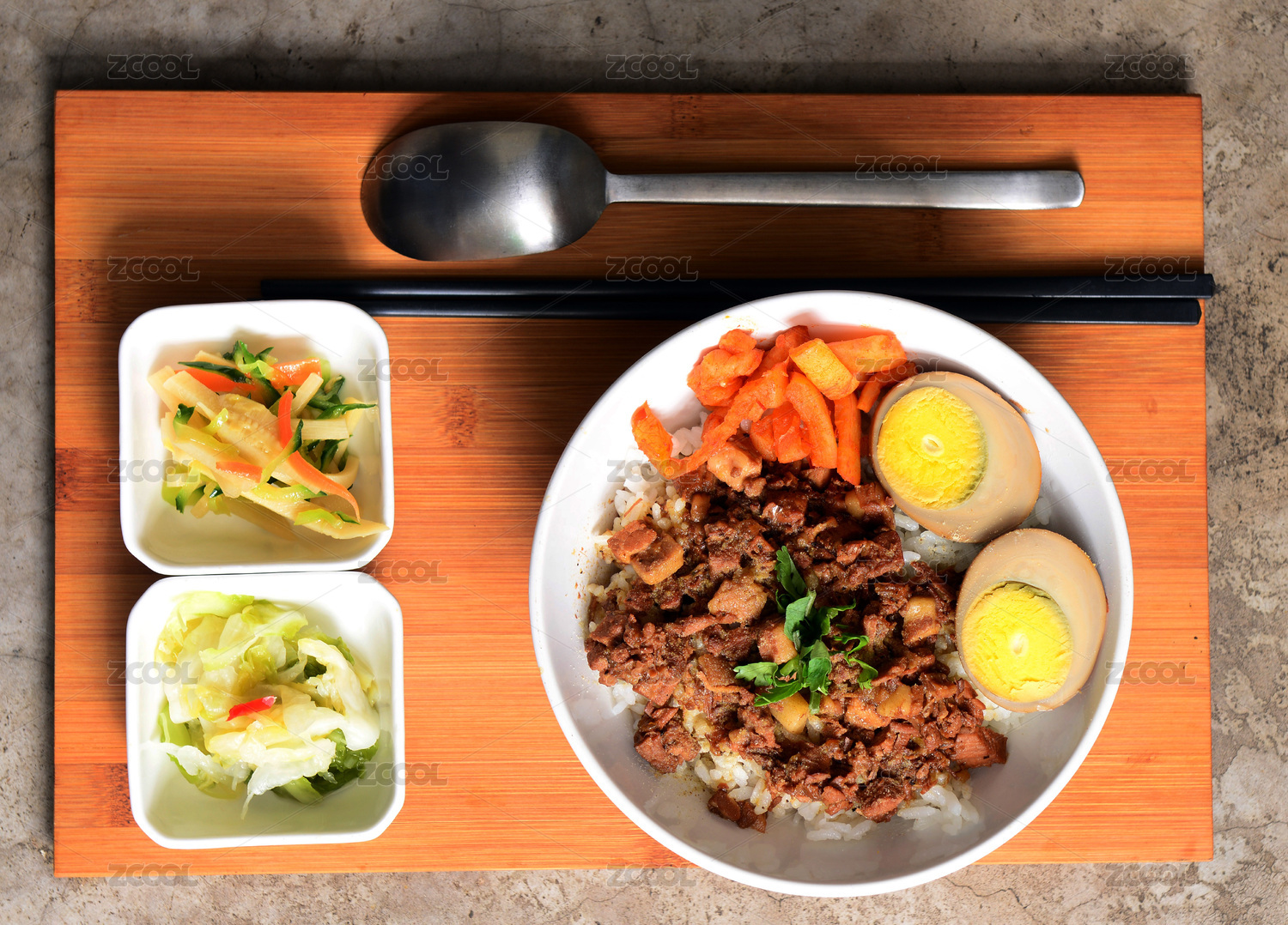 白色背景木紋底的一碗臺(tái)灣鹵肉飯?zhí)貙?/div>