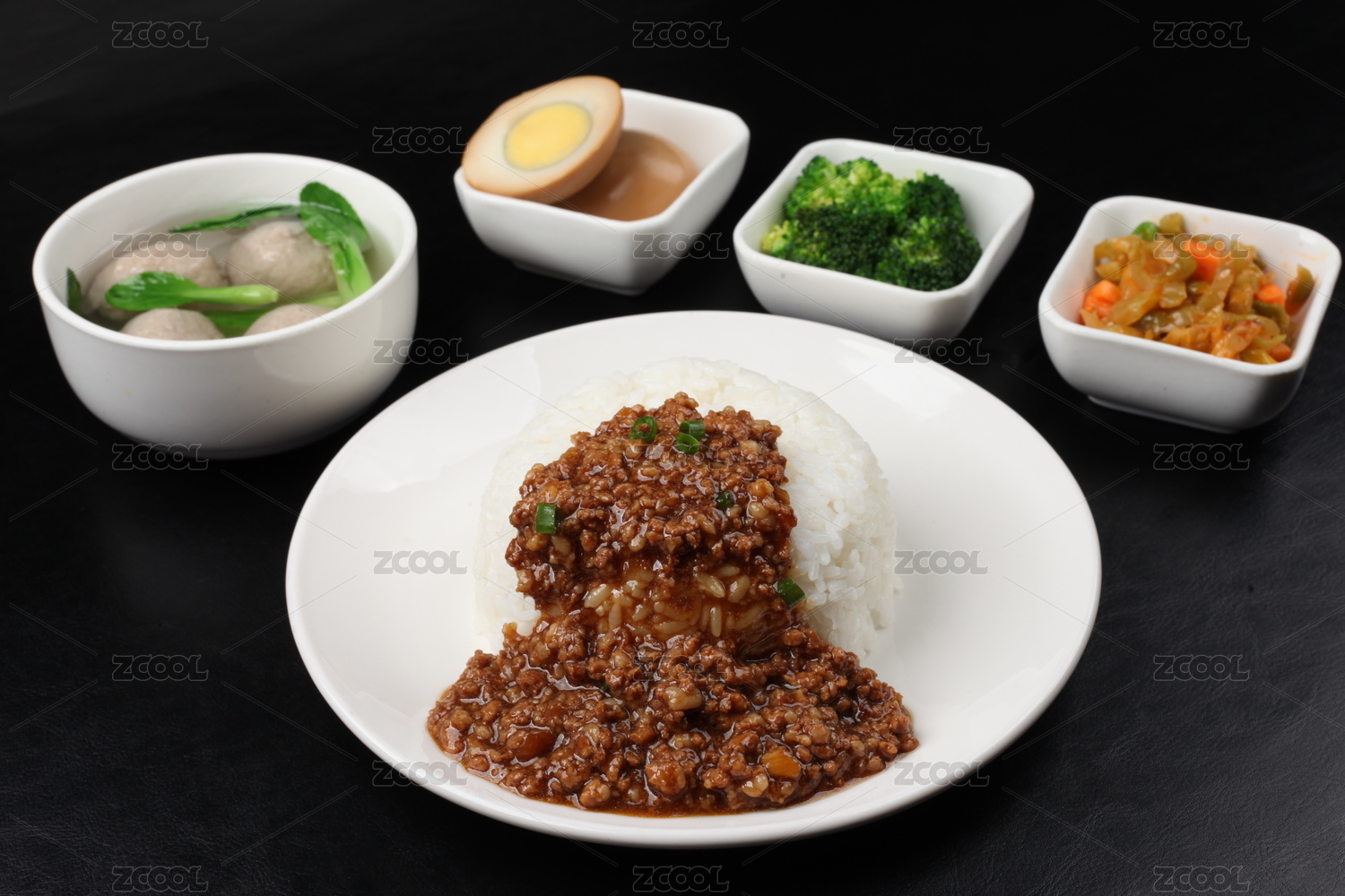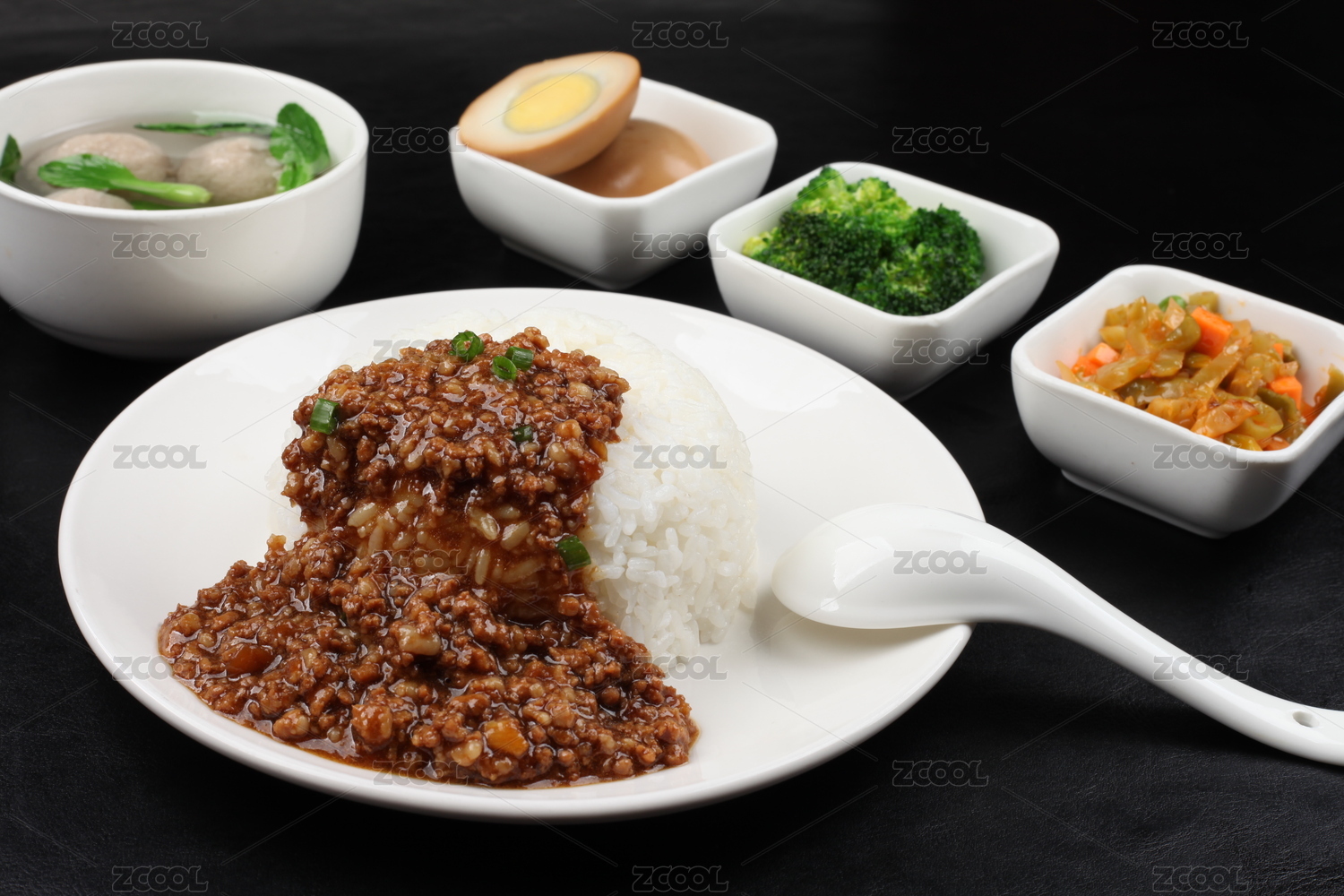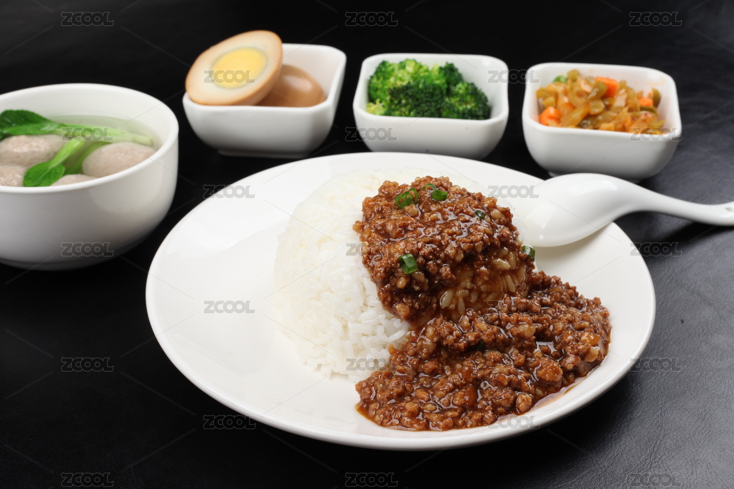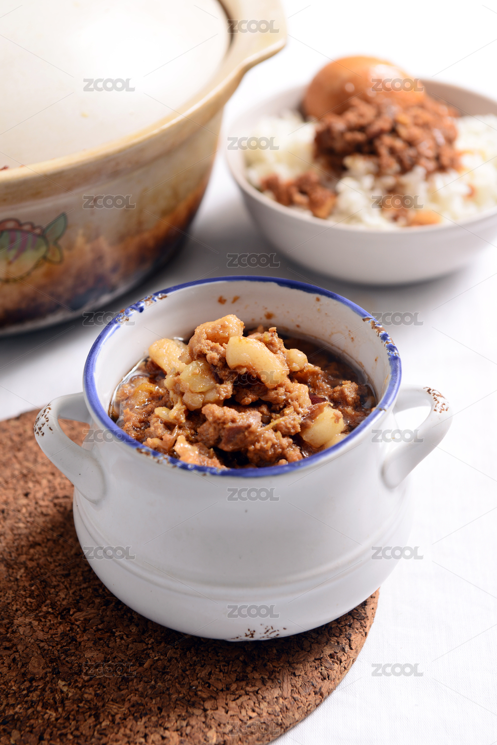 白色背景木紋底的一碗臺(tái)灣鹵肉飯?zhí)貙?/div>