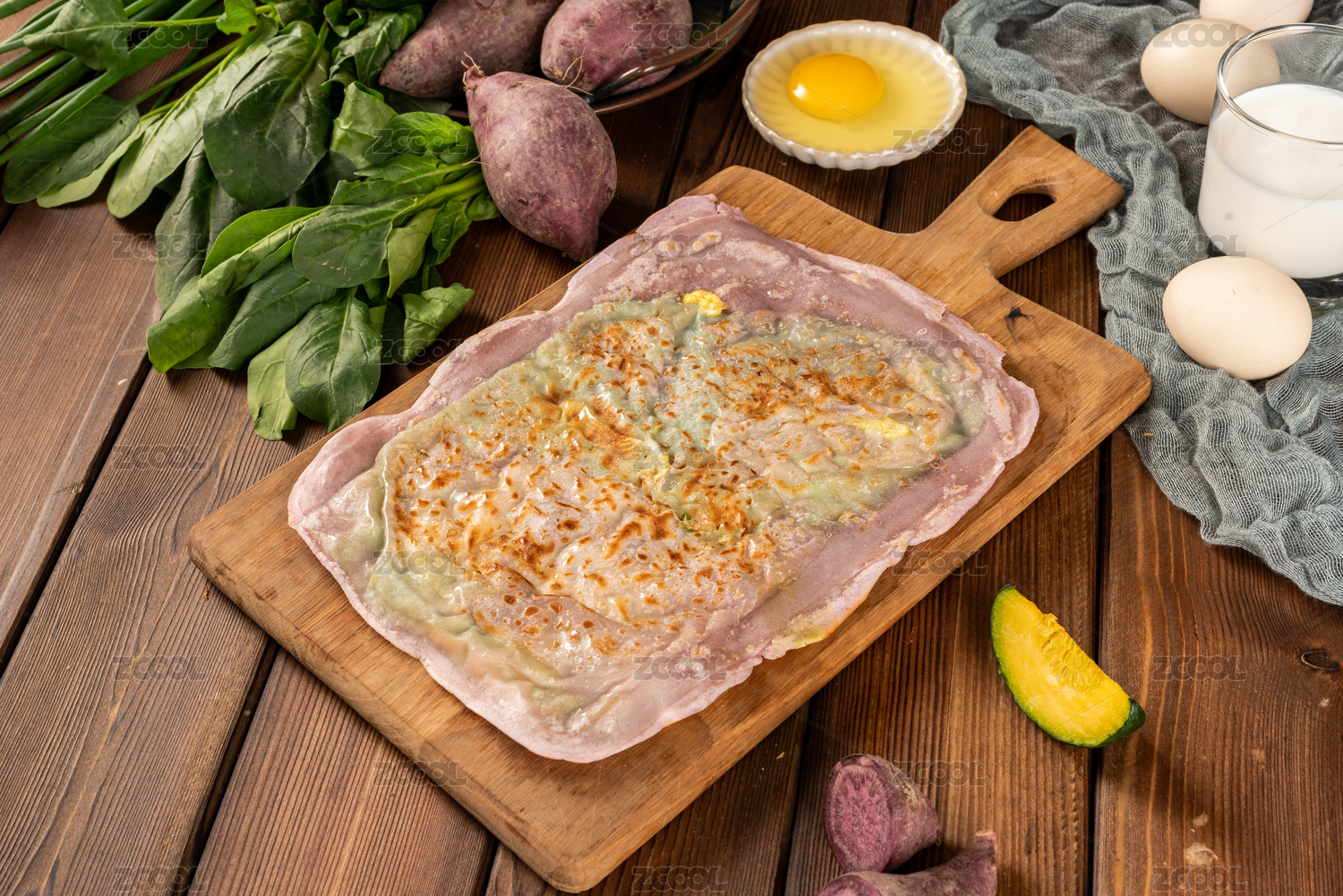 木板背景上小吃美食紫薯味灌餅