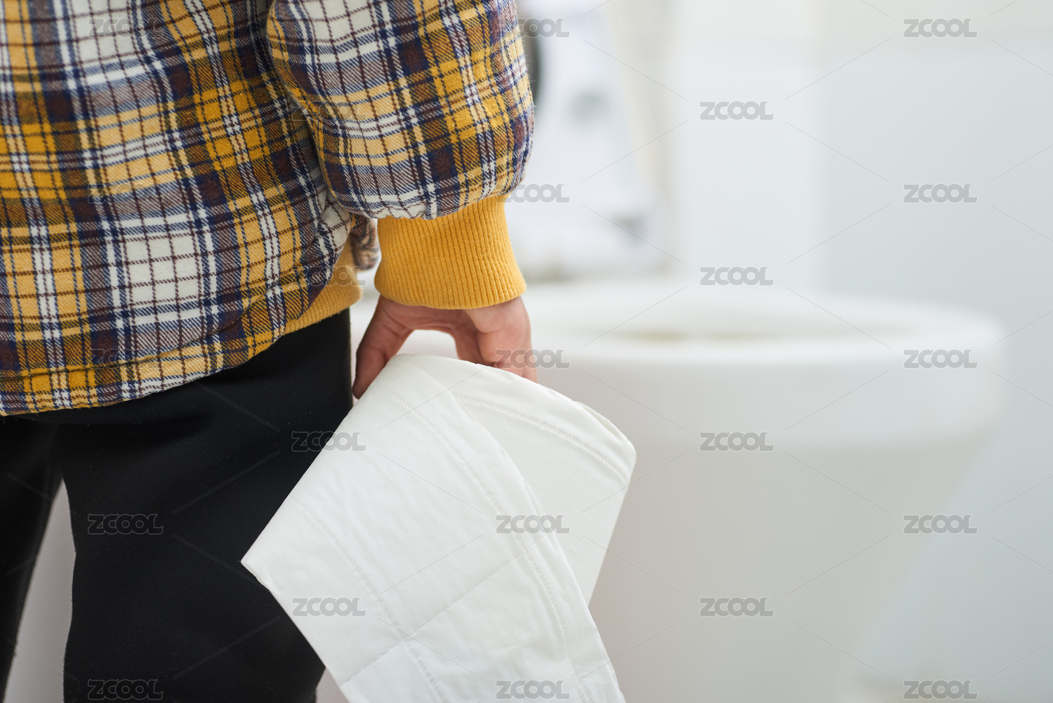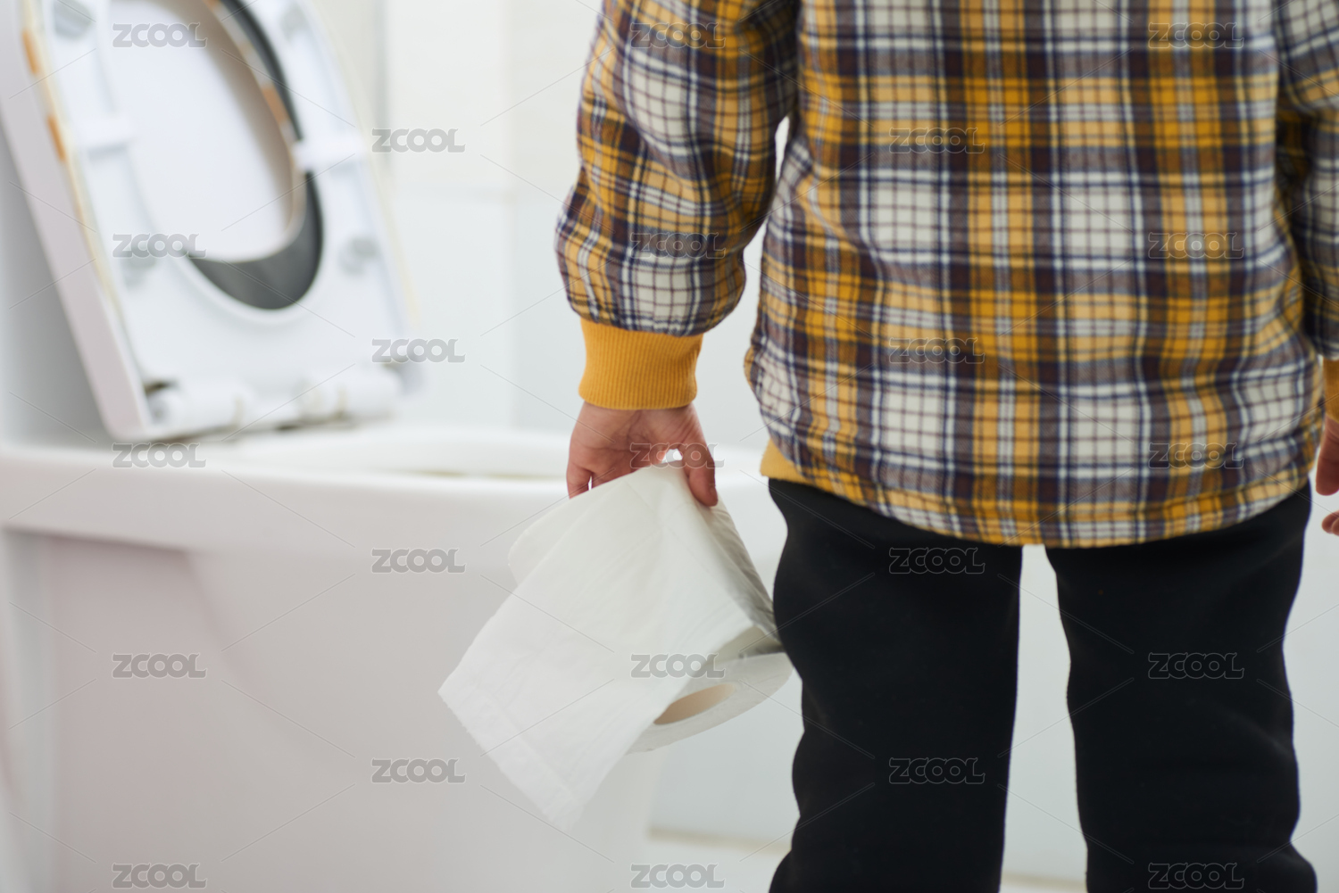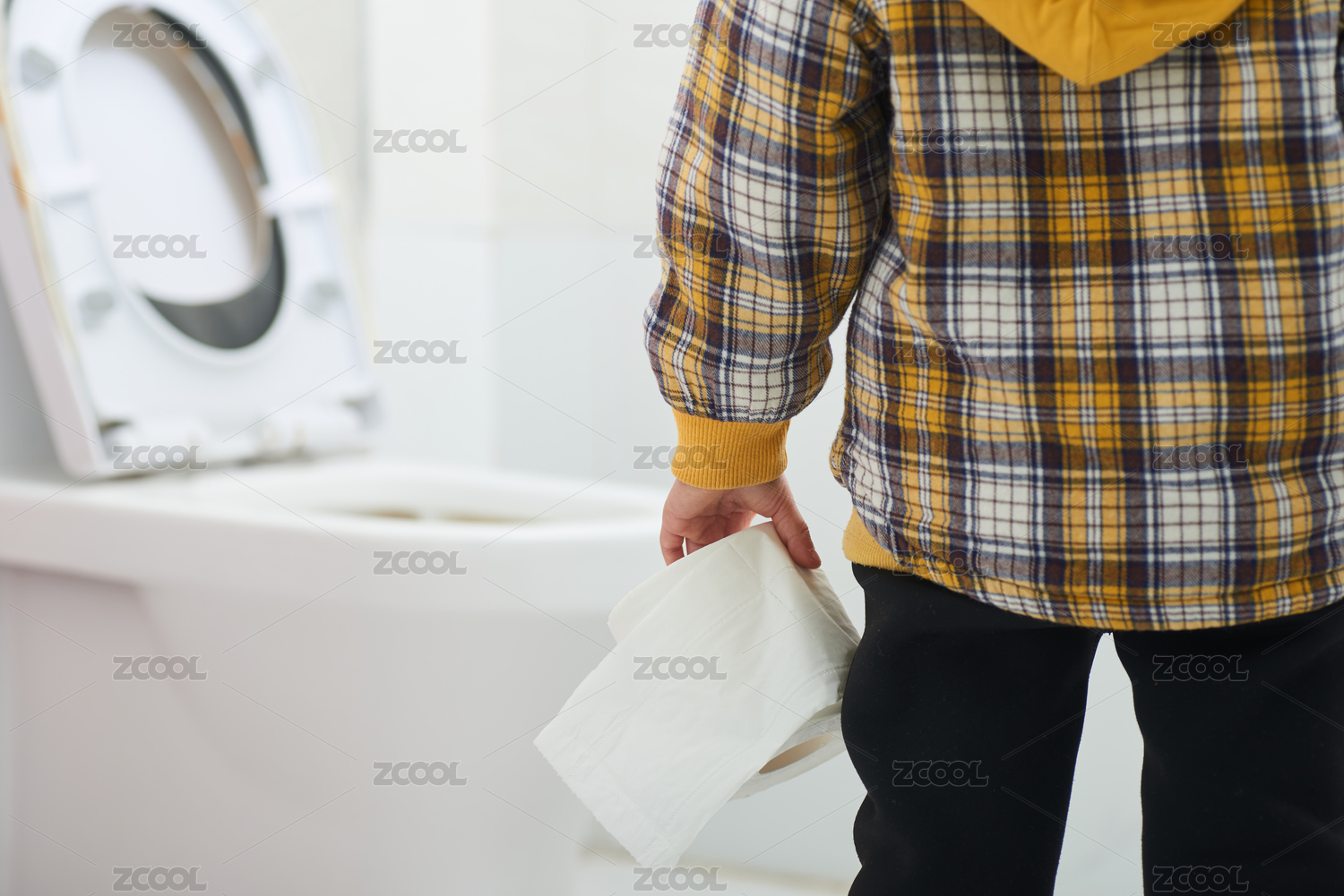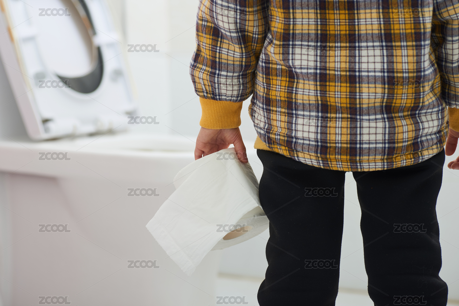 手拿卷紙的幼童站在衛(wèi)生間的抽水馬桶前