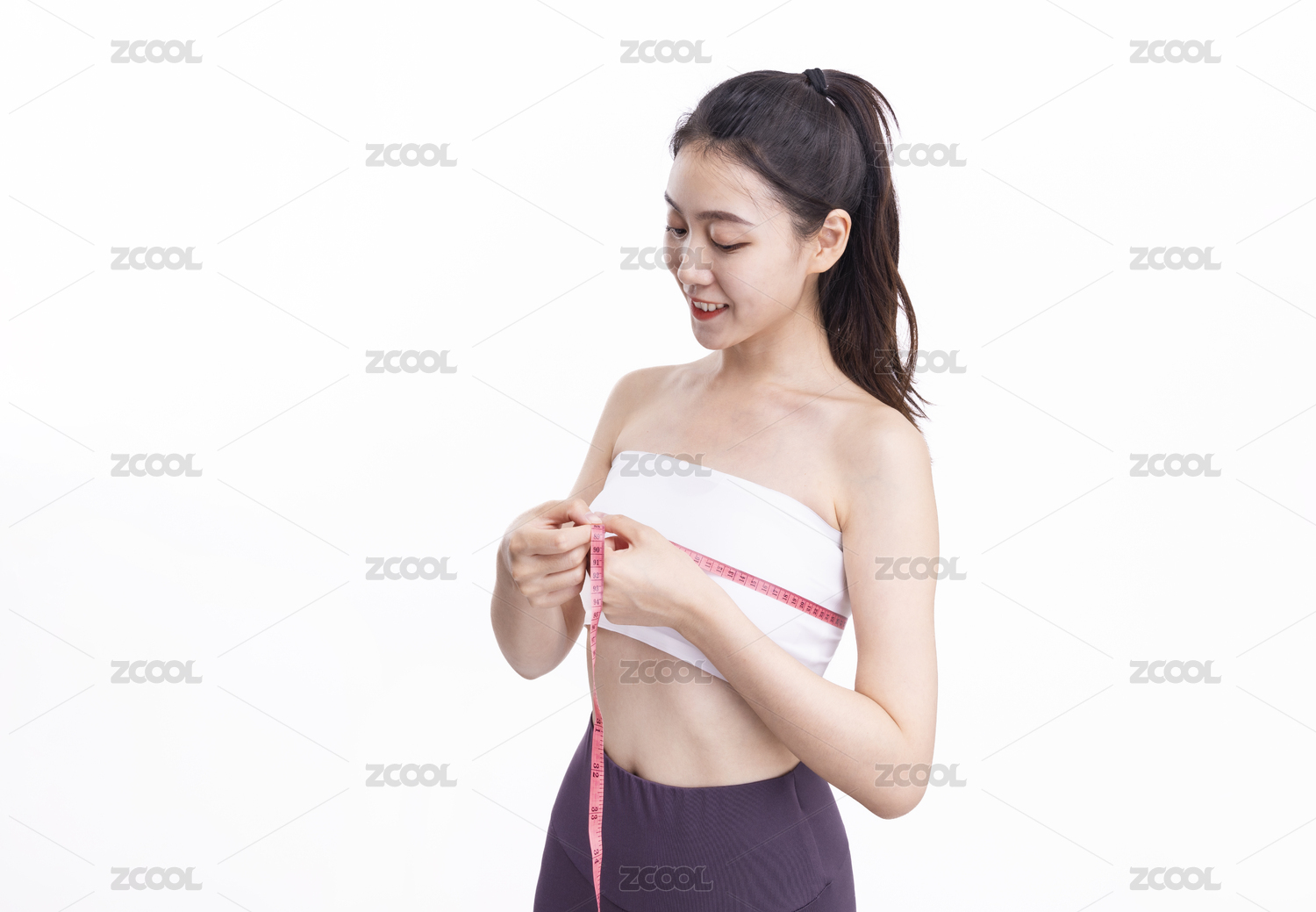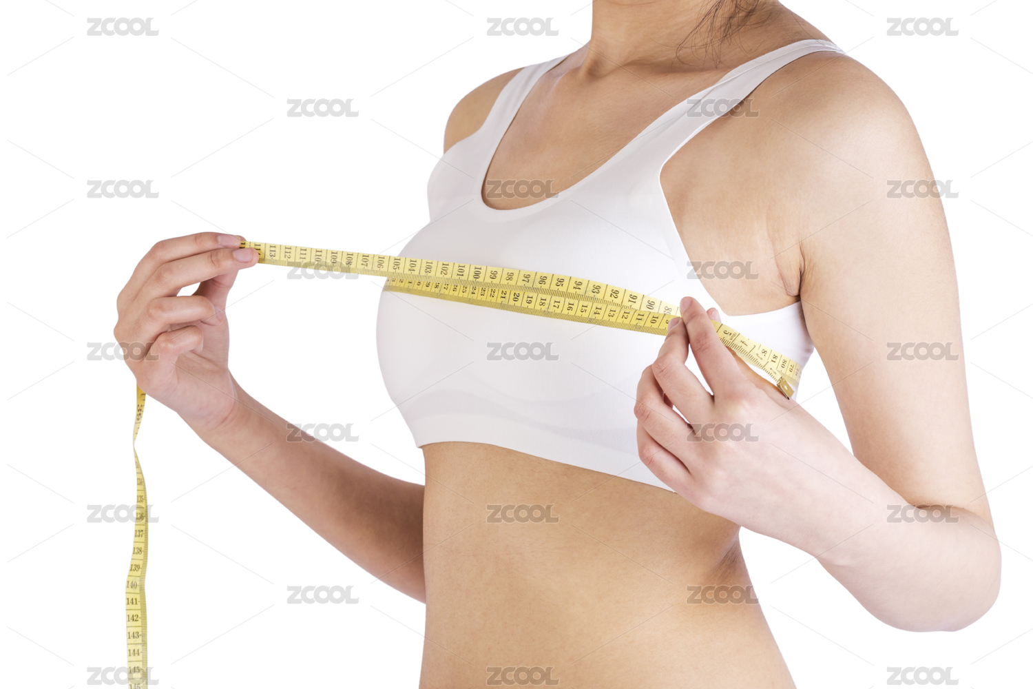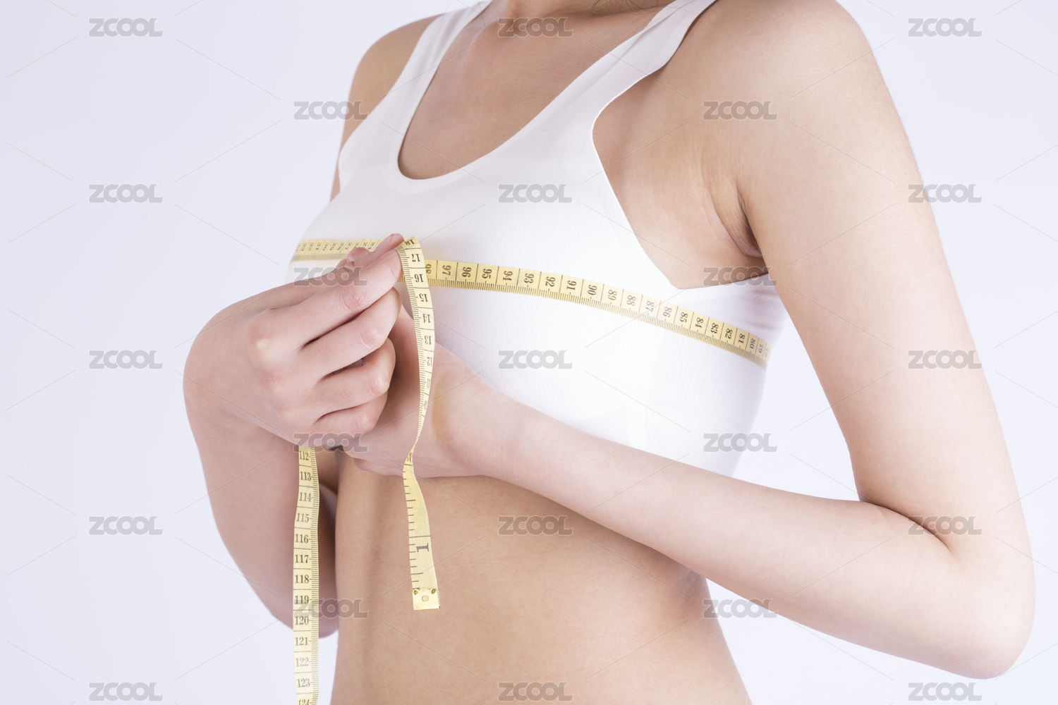 穿著白色運(yùn)動(dòng)內(nèi)衣的魅力女性在測量胸部