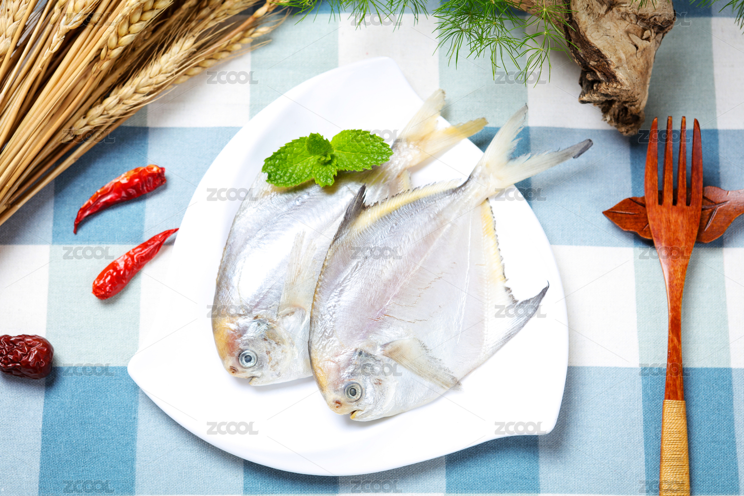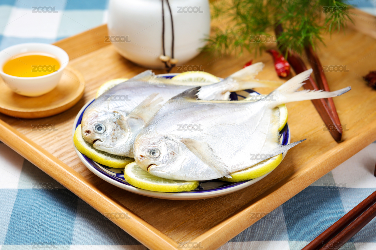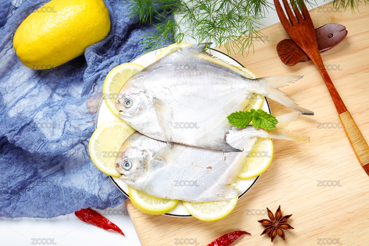 餐具上的冰鮮白鯧魚