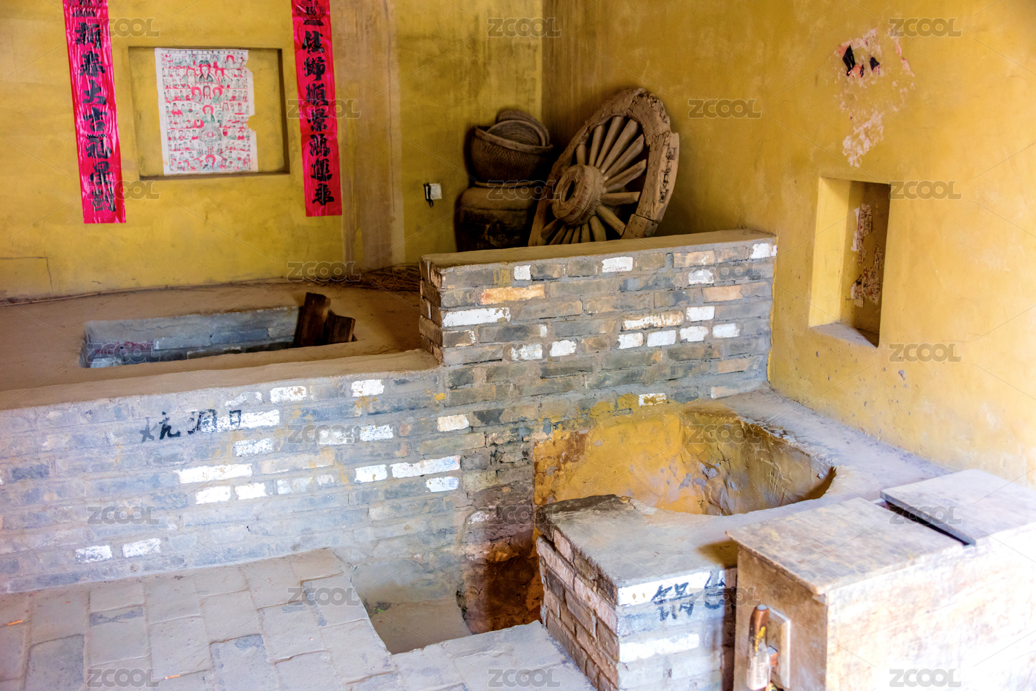 棕色的地道戰(zhàn)冉莊農(nóng)村井和圍墻插畫背景