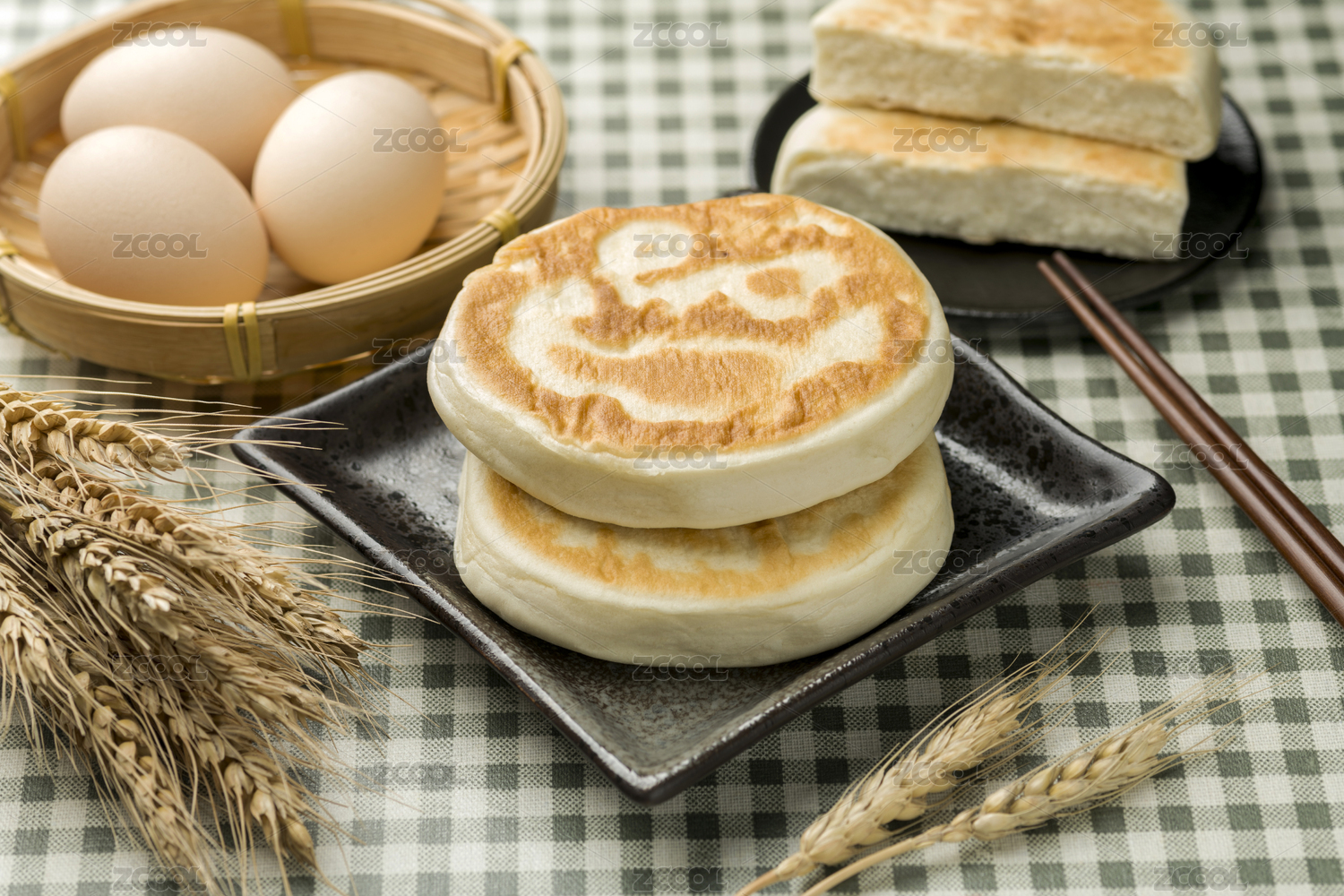 一盤發(fā)面餅特寫格子桌布背景