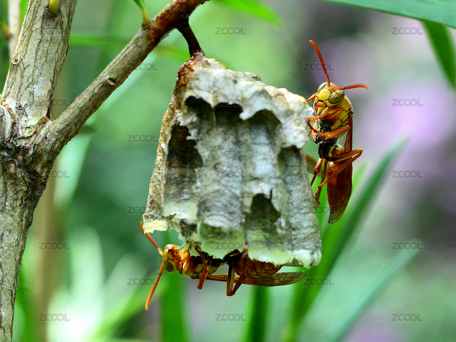 綠葉間的黃蜂與蜂巢