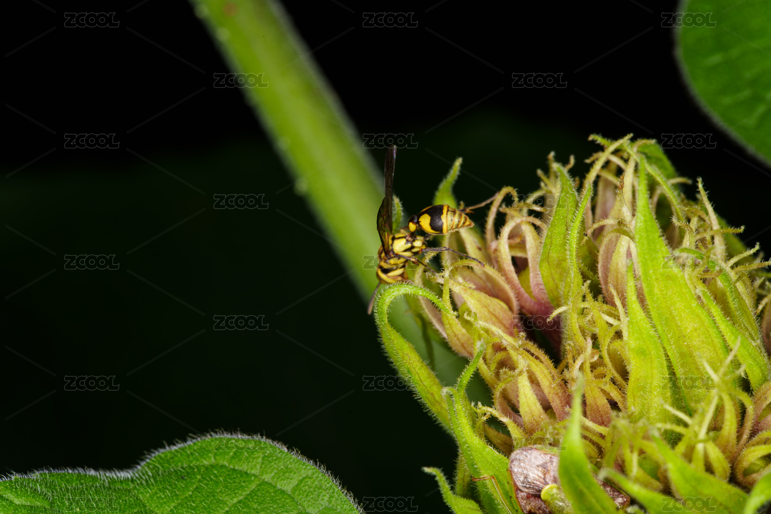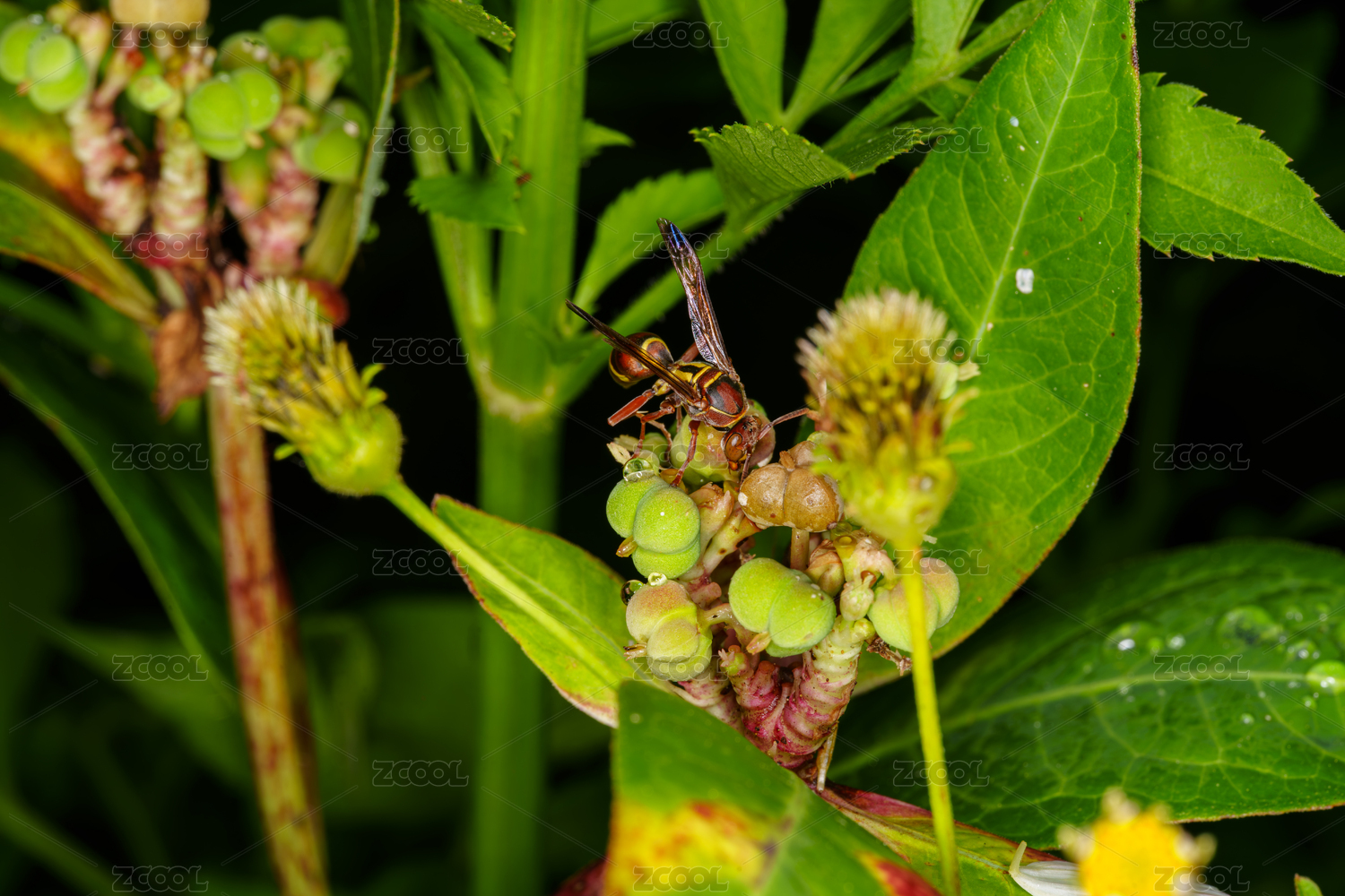 黃蜂停留在綠色植物上的特寫畫面