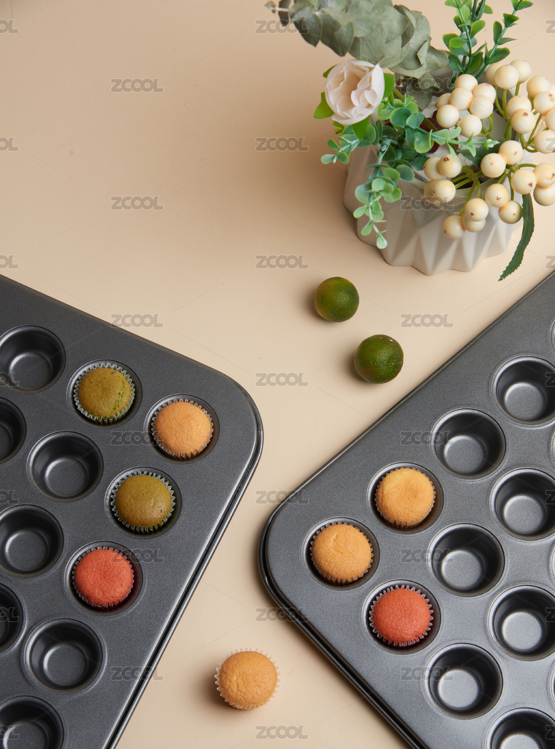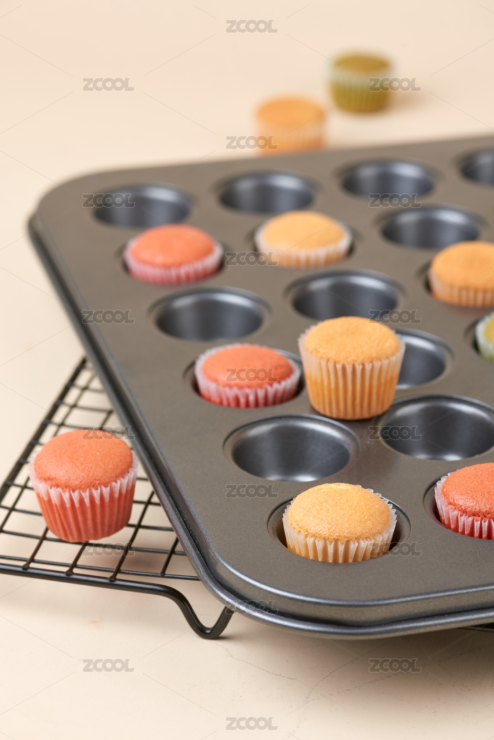 橙色桌面上烤盤里的紙杯蛋糕柔光源