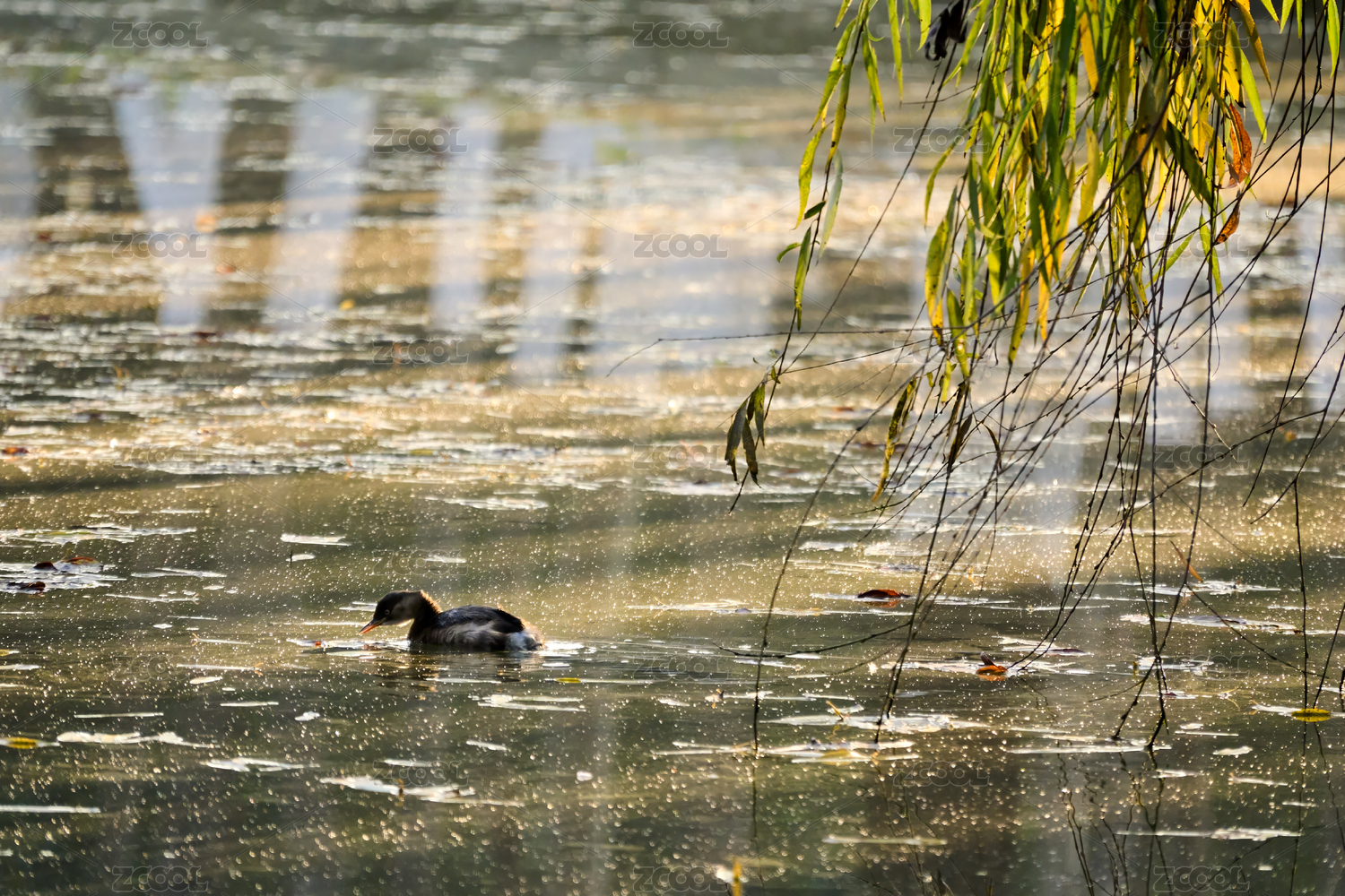 小鸊鷉安靜浮在柔光湖面上,低頭覓食