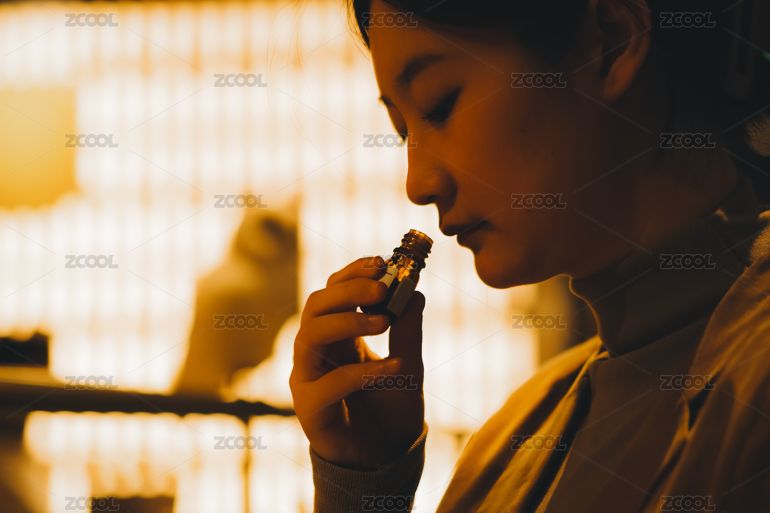一個(gè)女人在柔光中品味香水香氣