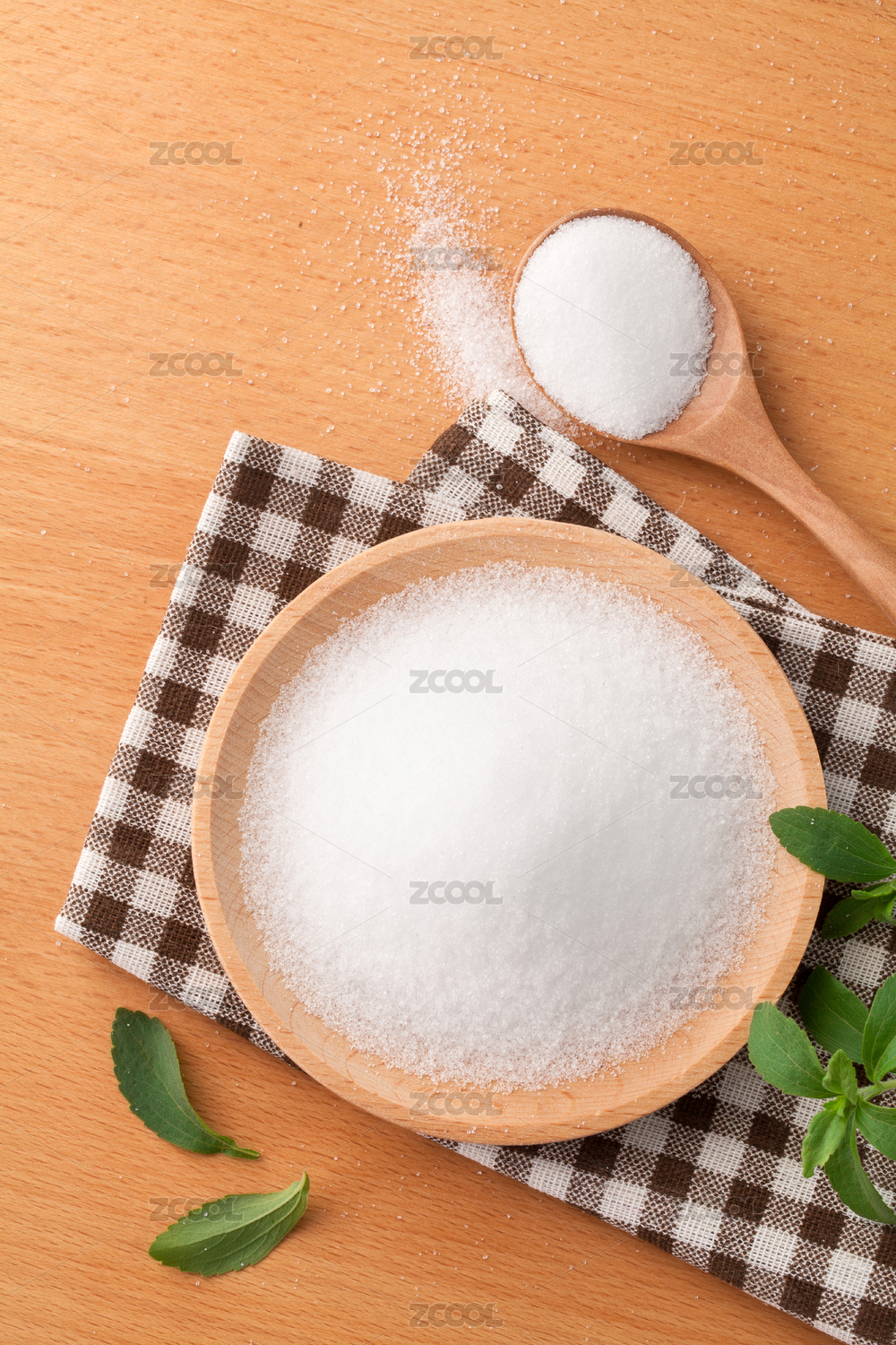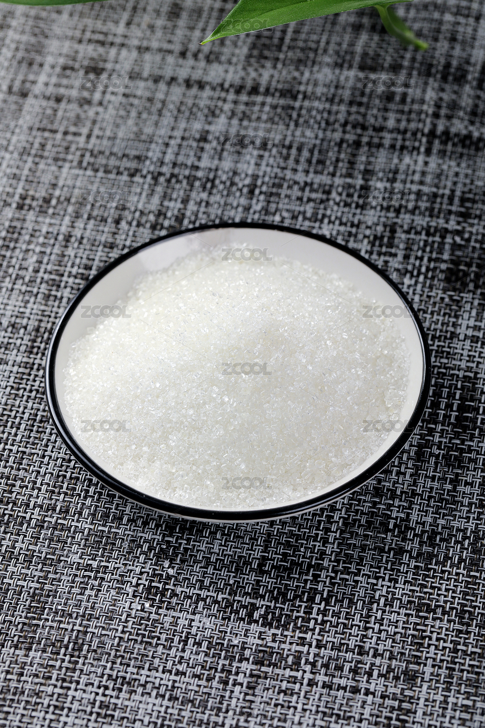 俯拍餐桌上的一碟白砂糖