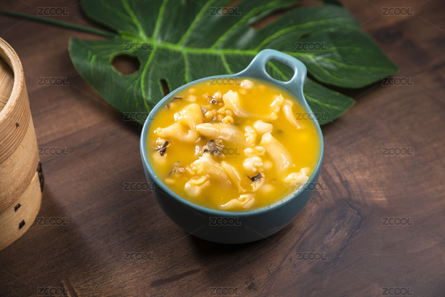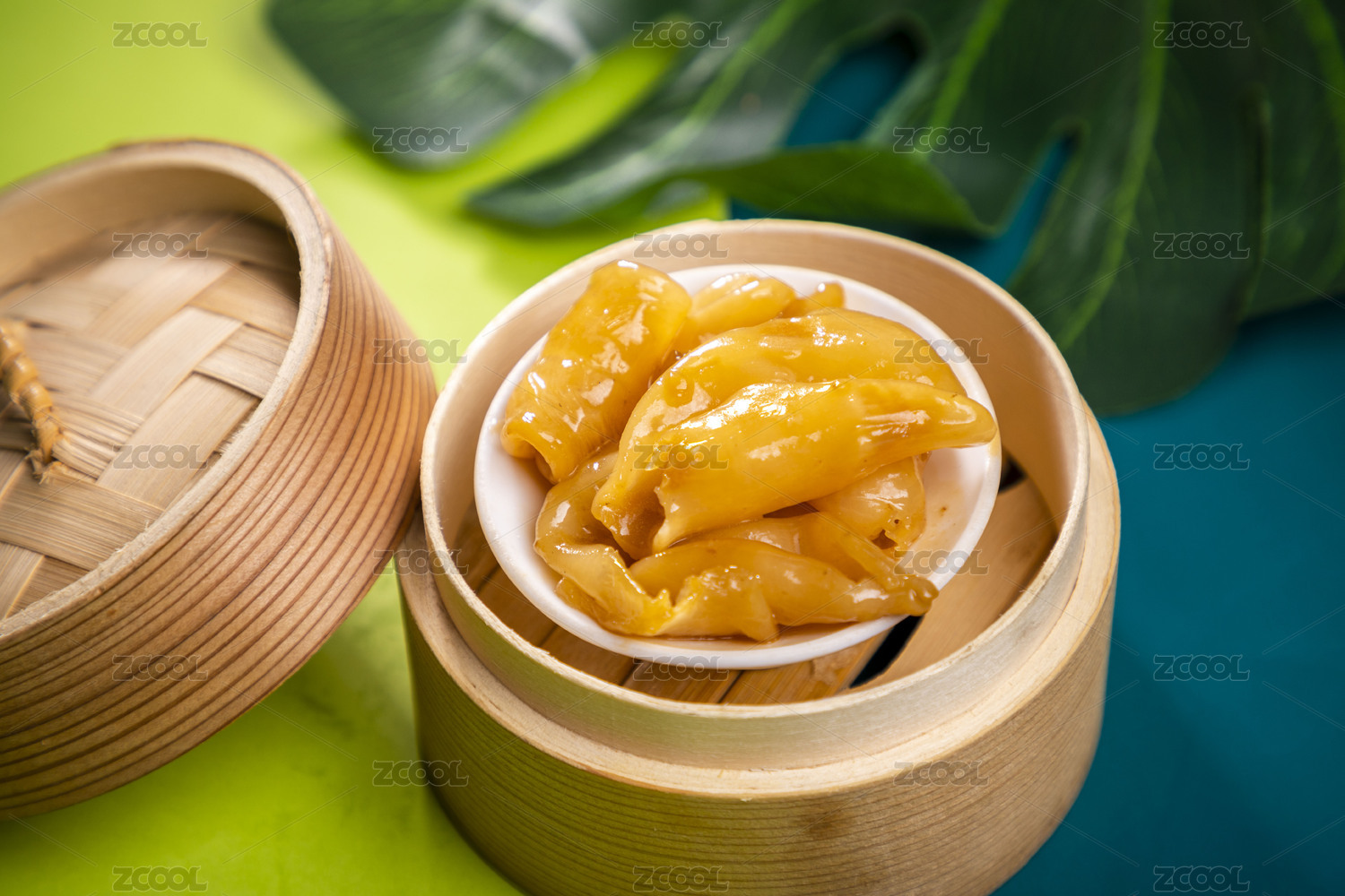 藍(lán)綠色卡紙上放著一份金湯花膠