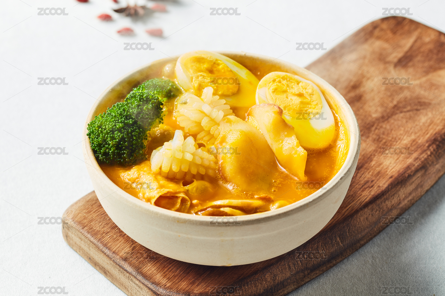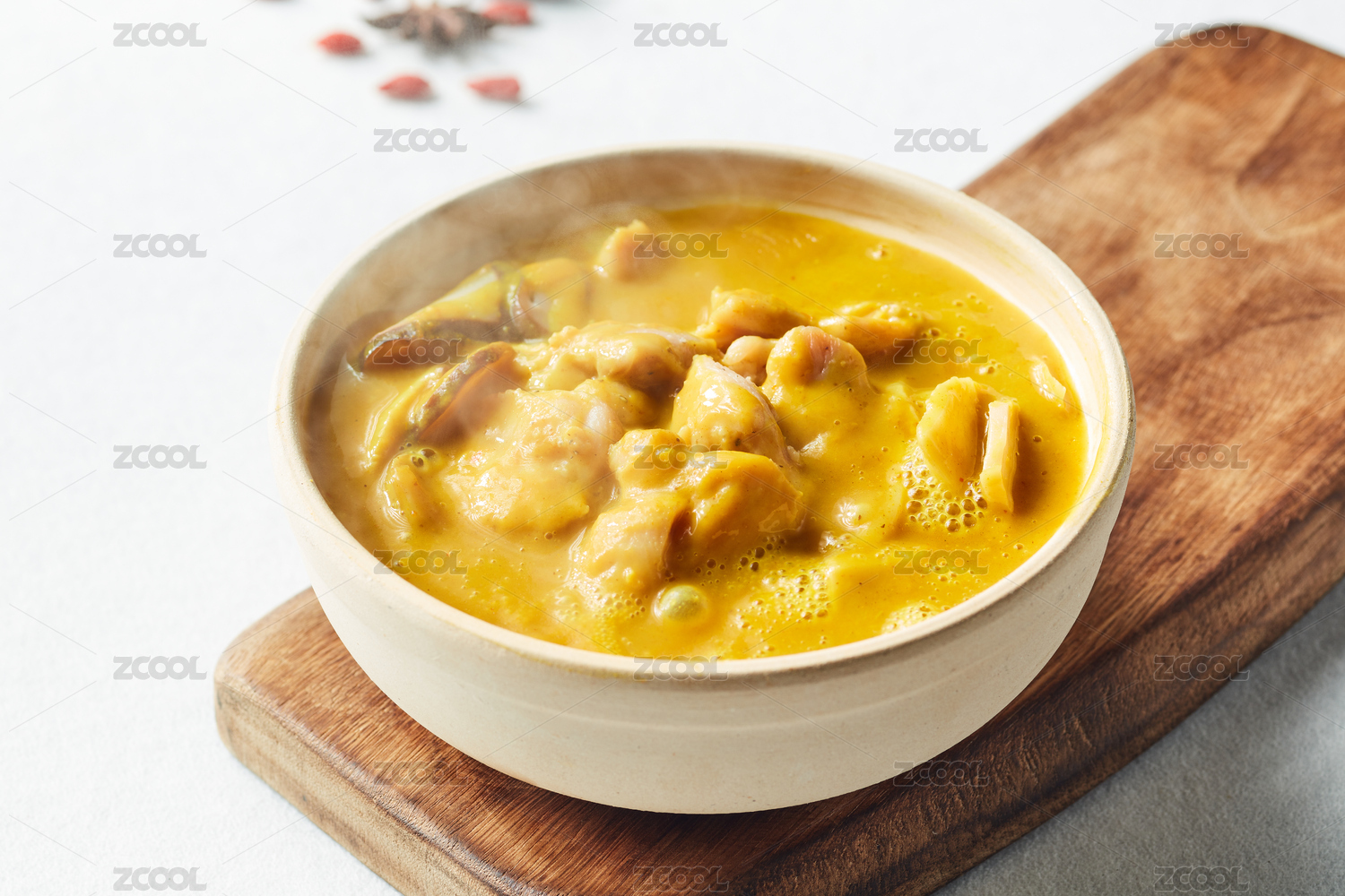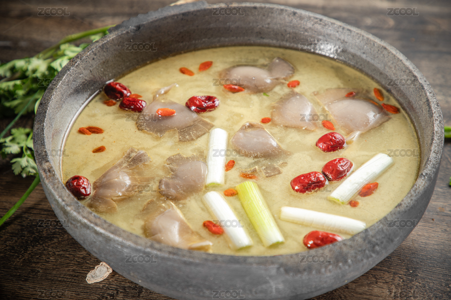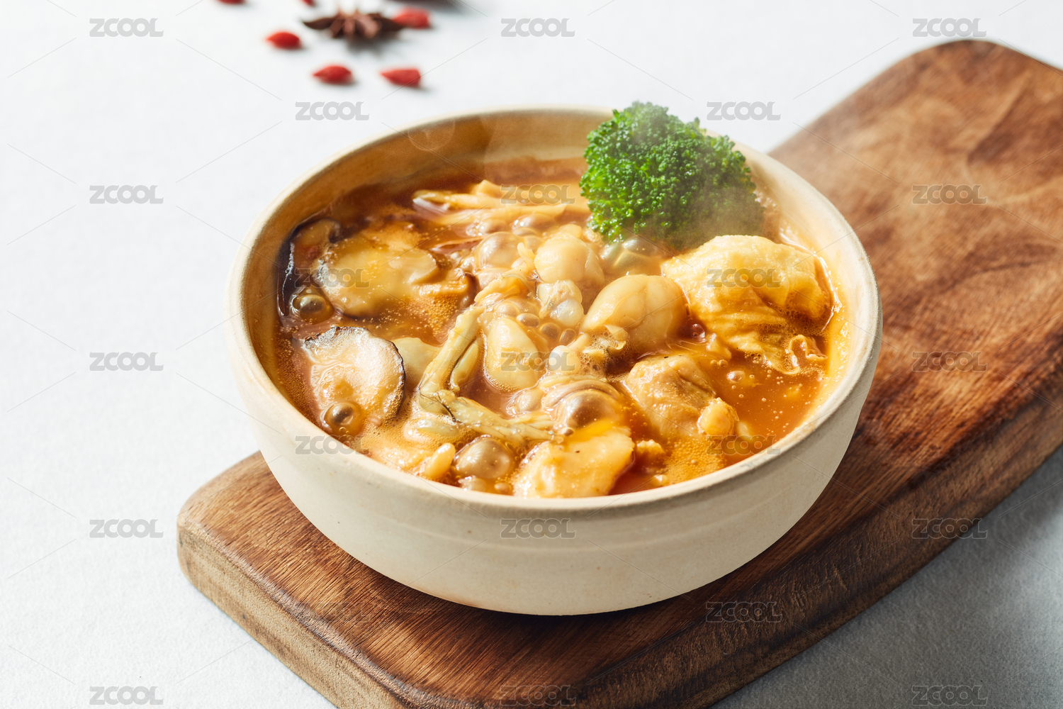 棕色木紋桌上放著一盤(pán)高湯平菇砂鍋