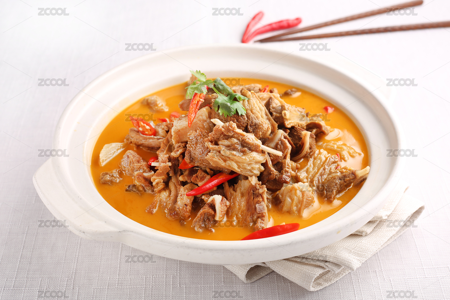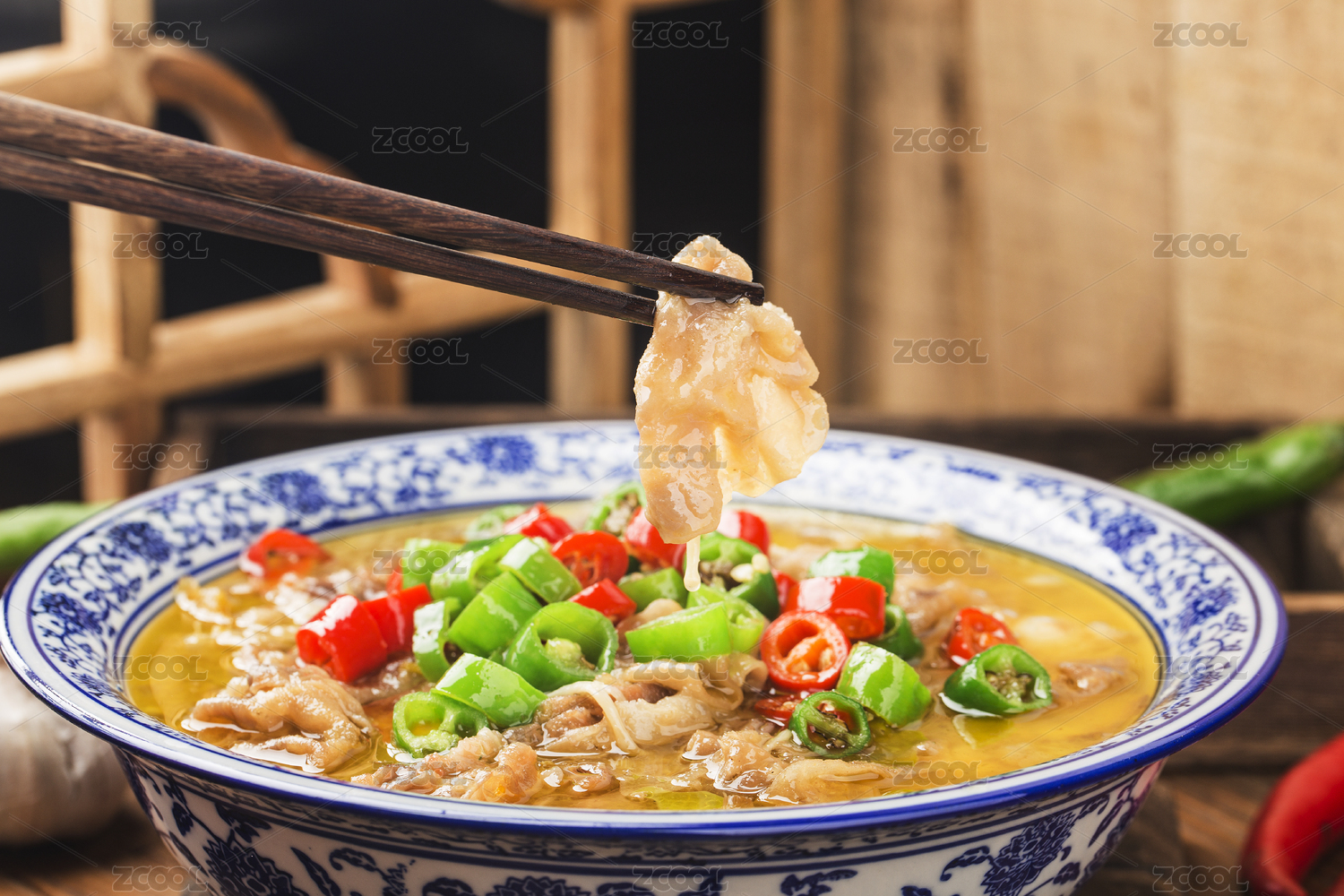 裝有金湯肥牛的白碗,放在中式雕花窗戶(hù)旁