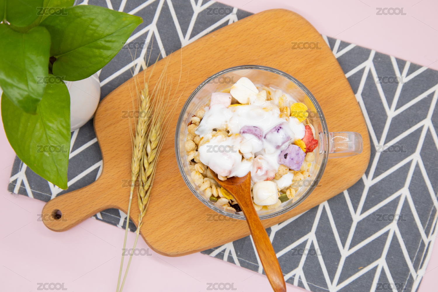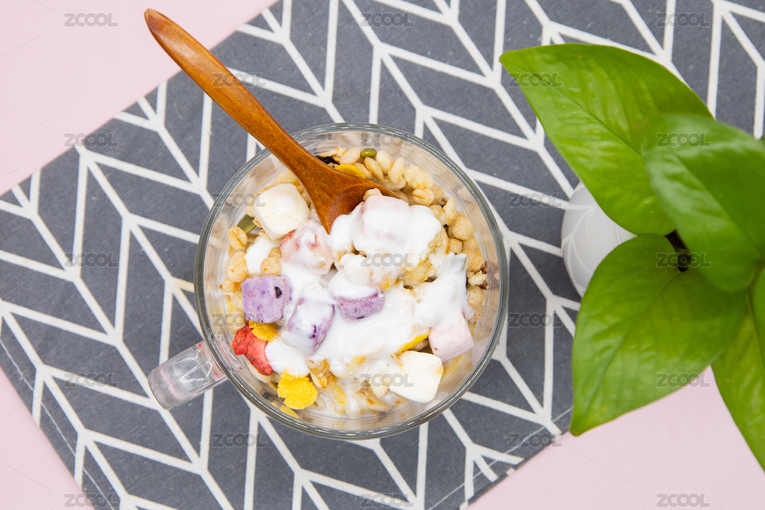 粉色背景營養(yǎng)早餐一杯酸奶燕麥脆