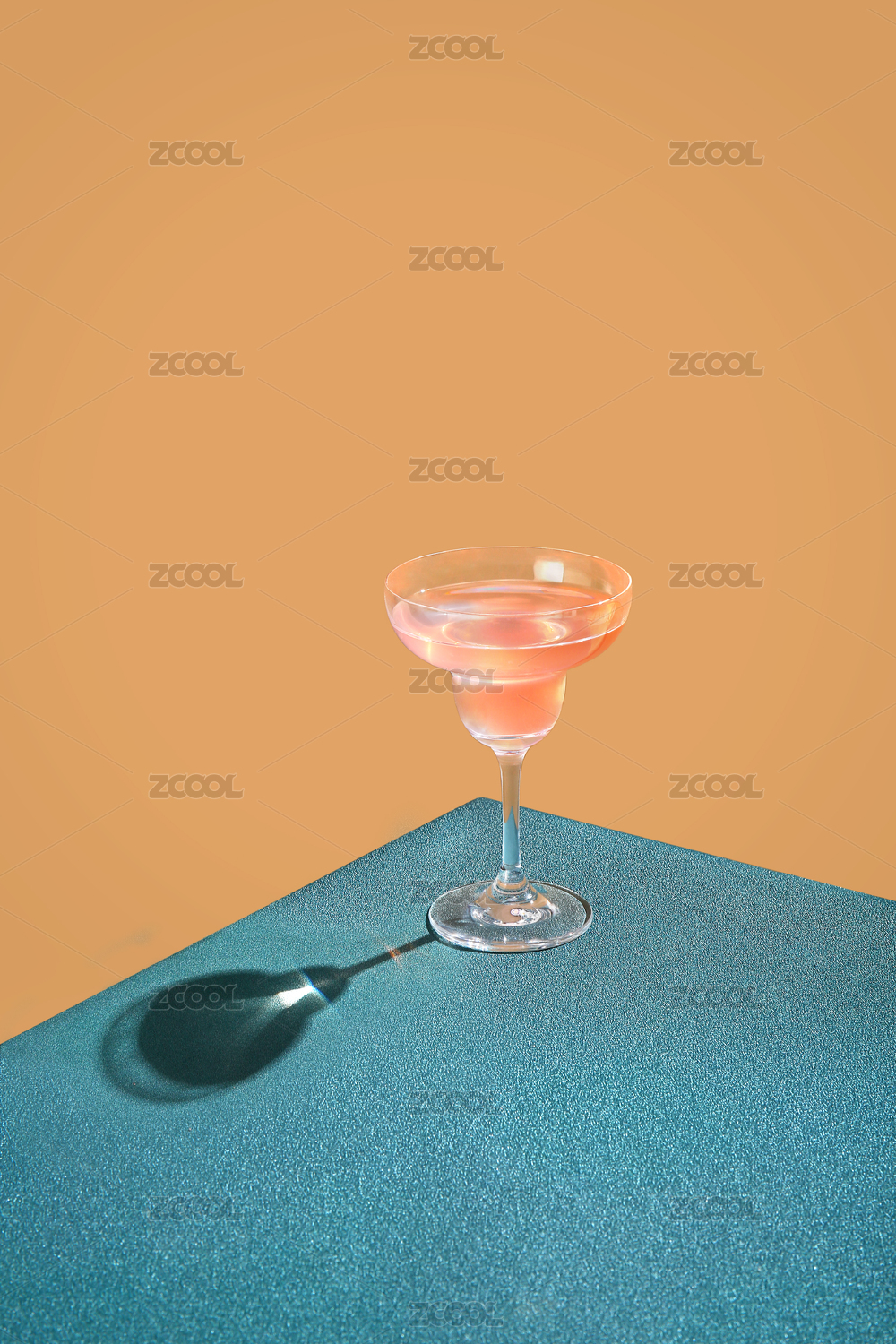 一杯粉色的雞尾酒放在藍(lán)色的桌面上l
