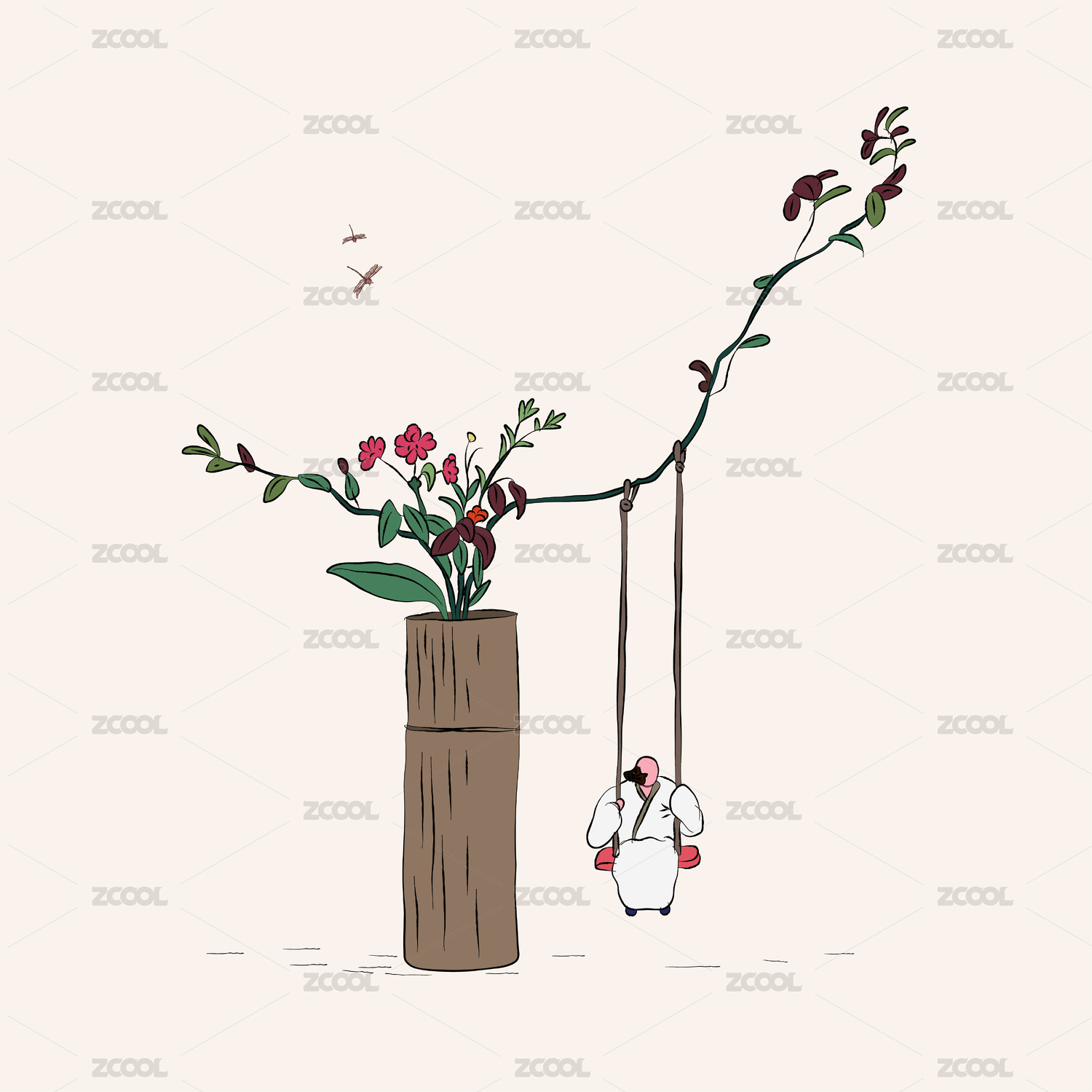 竹瓶插花秋千古人中國(guó)風(fēng)矢量插畫
