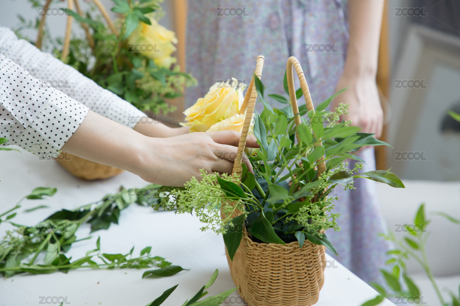 一個(gè)年輕漂亮的亞洲女孩在家插花