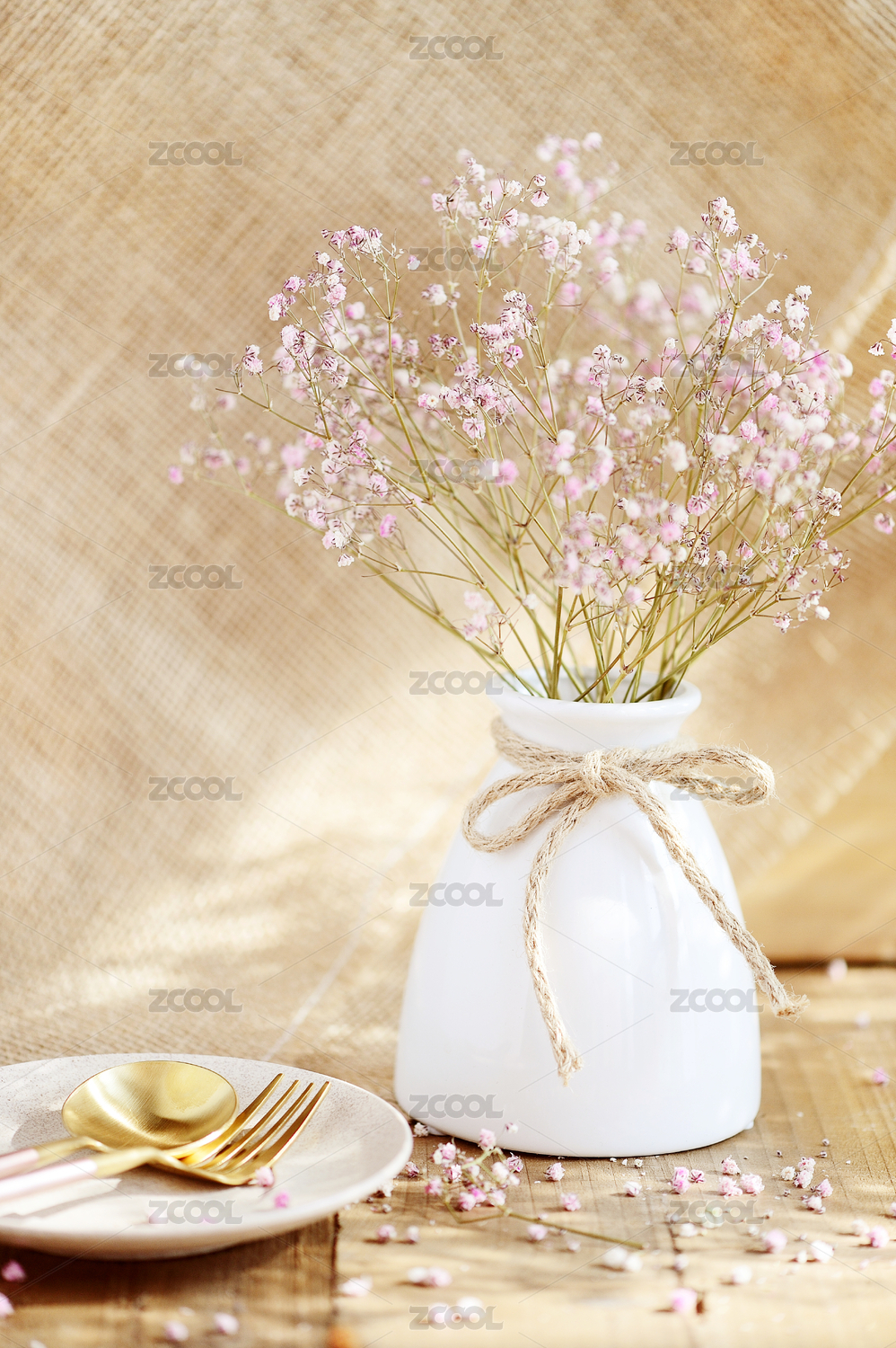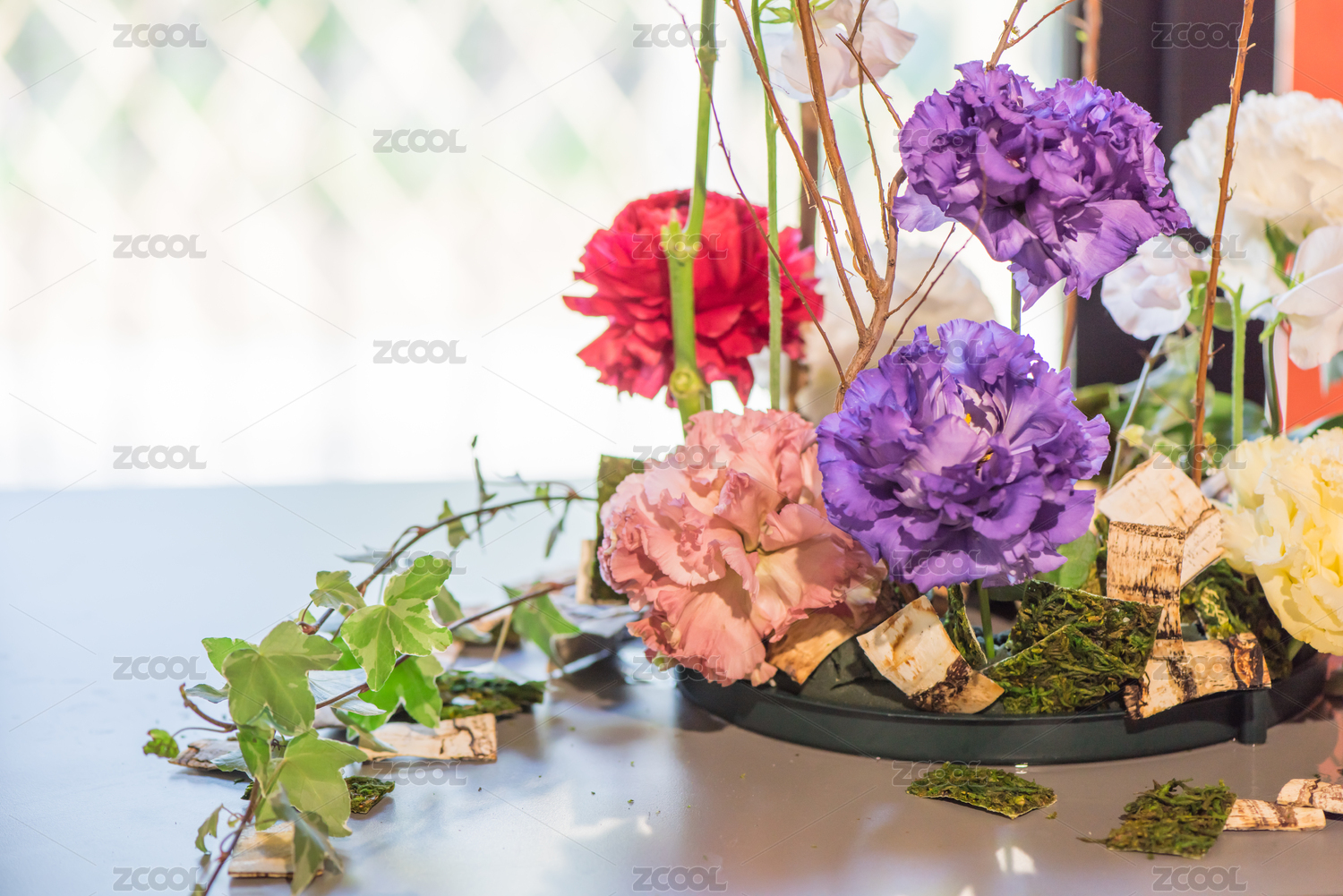 室內(nèi)切花裝飾插花,鮮花和樹(shù)枝放在桌子上