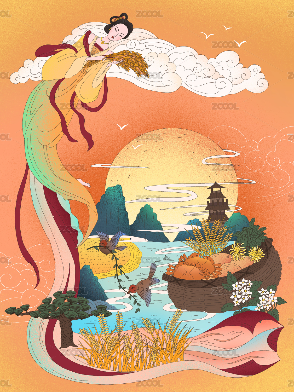 手繪中國風(fēng)國潮復(fù)古秋收豐收侍女圖插畫