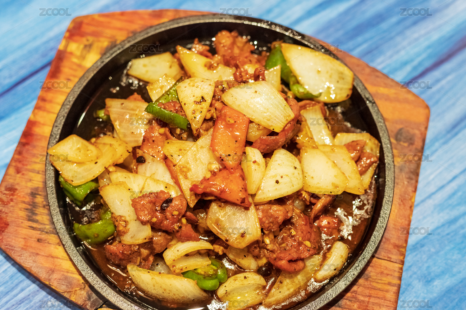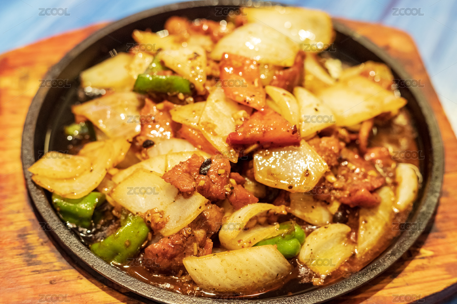 藍色木紋桌上的葷菜鐵板牛柳