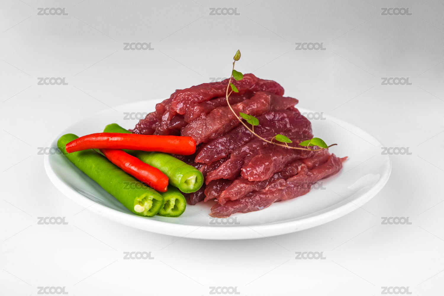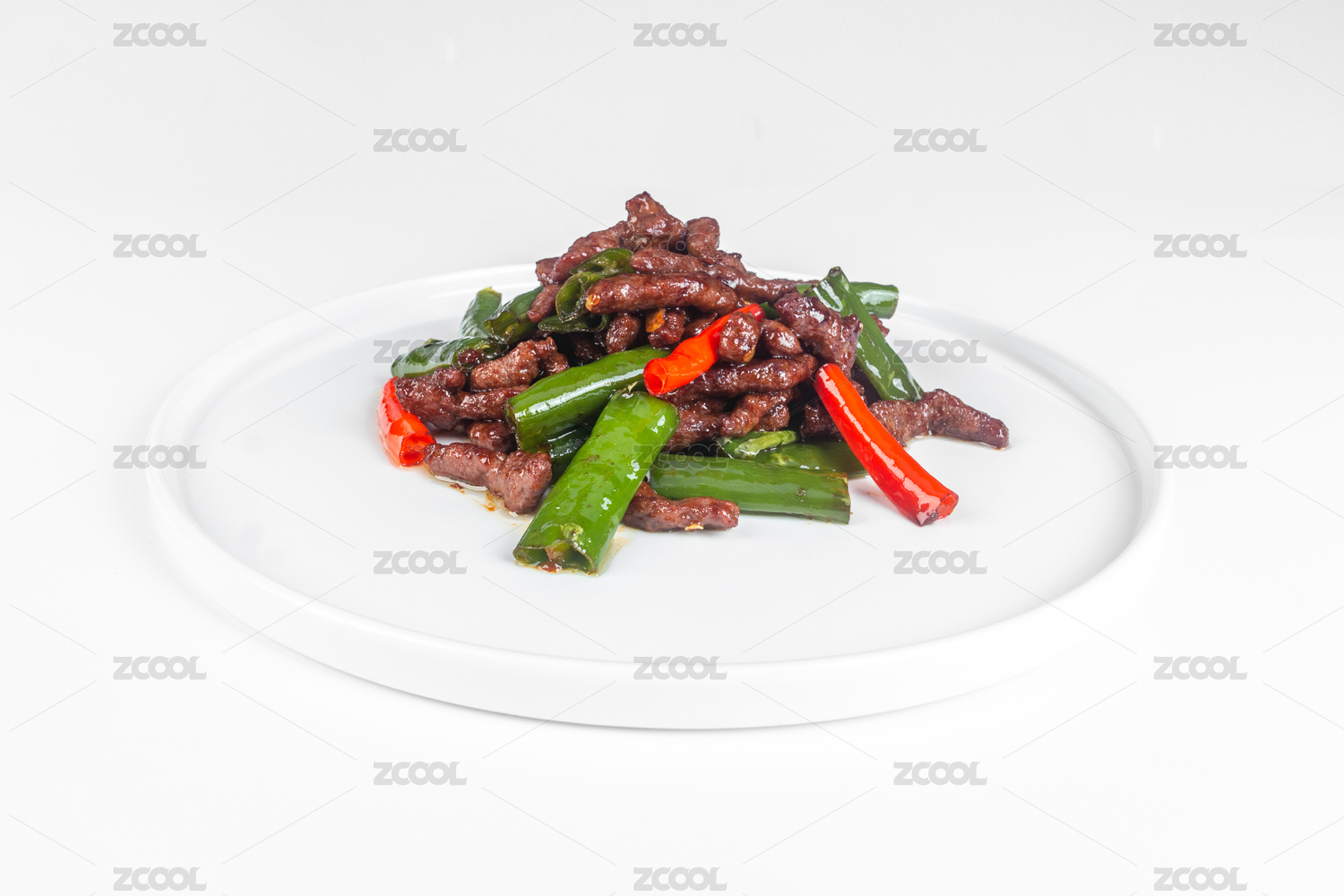 白色背景上白盤子里的杭椒牛柳