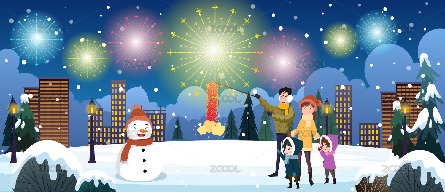 新年一家人堆雪人賞禮花插畫矢量圖橫版海報(bào)