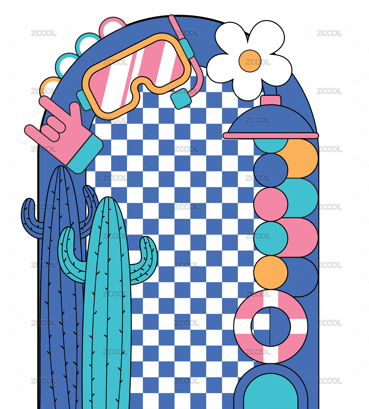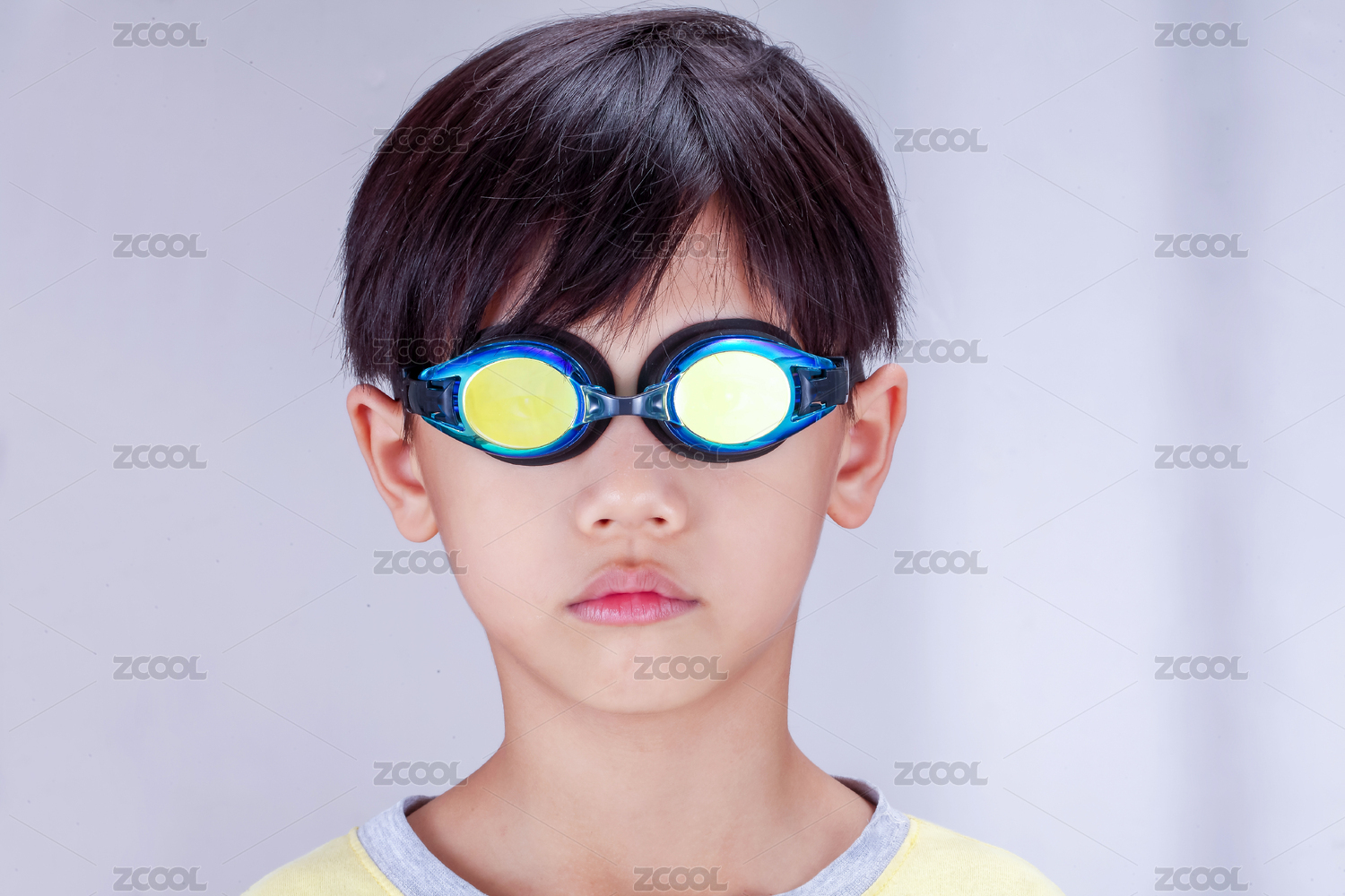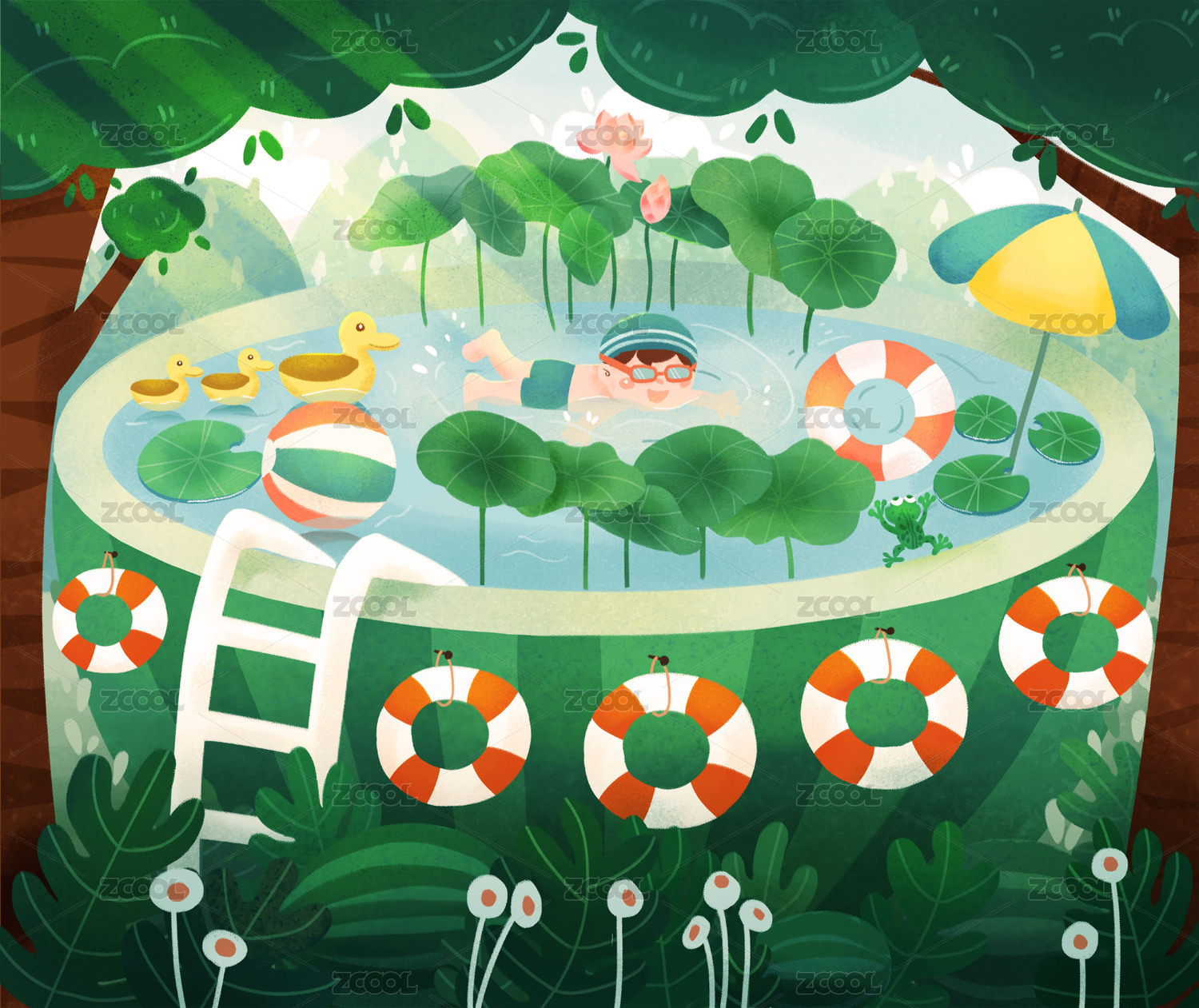 男孩戴泳鏡在飄泳圈的西瓜池里游泳兒童插畫