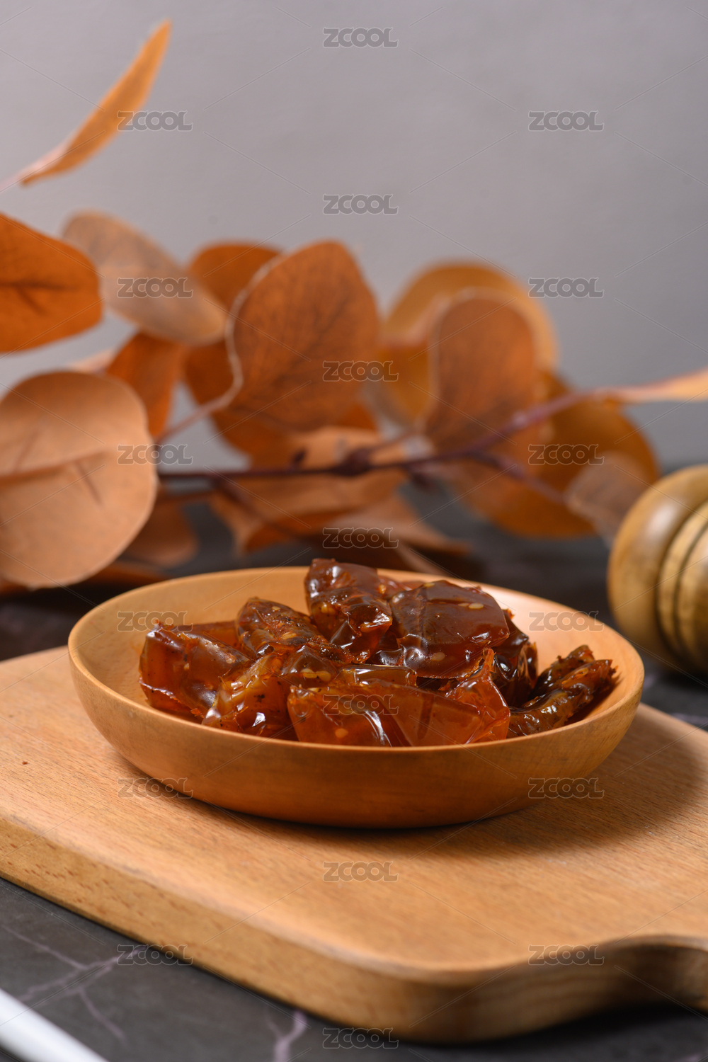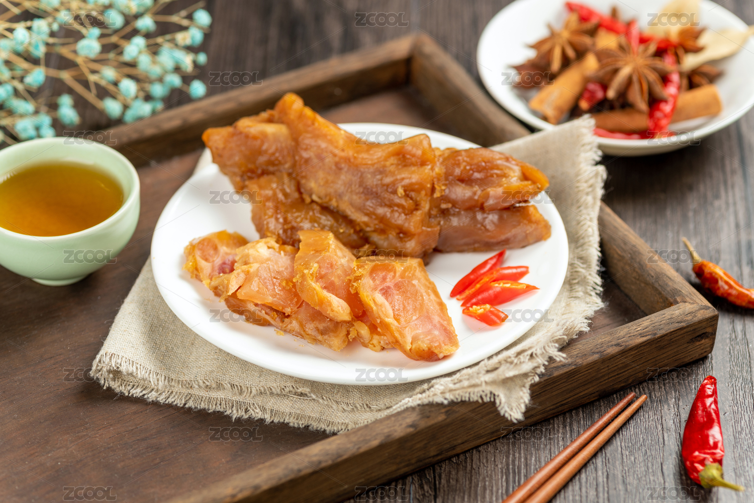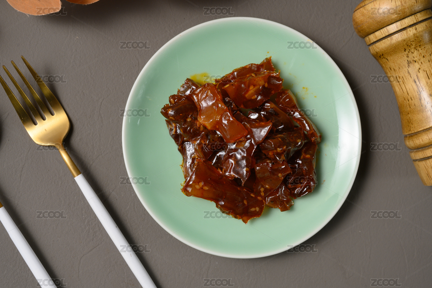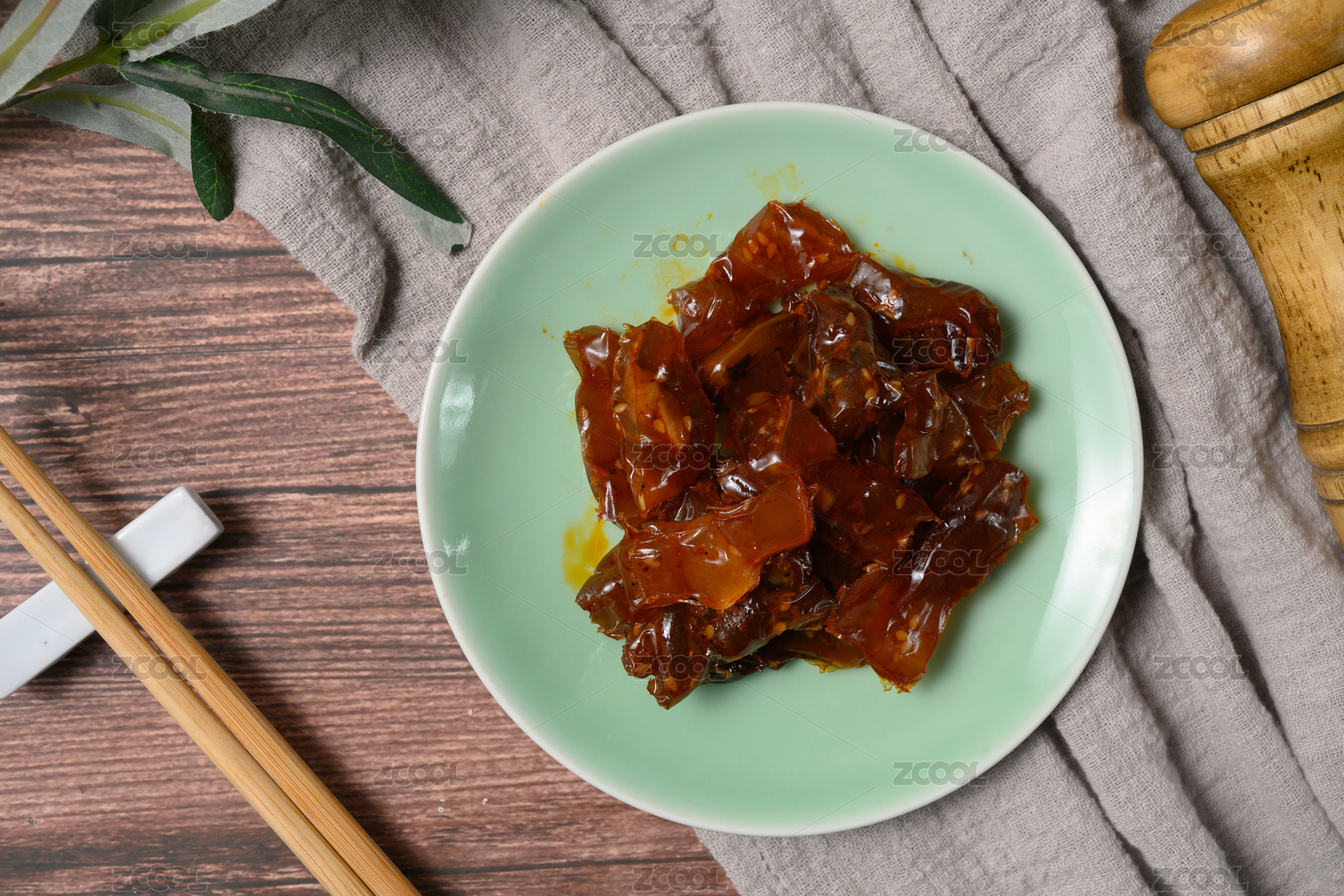 一盤醬牛蹄筋擺放在木桌面上