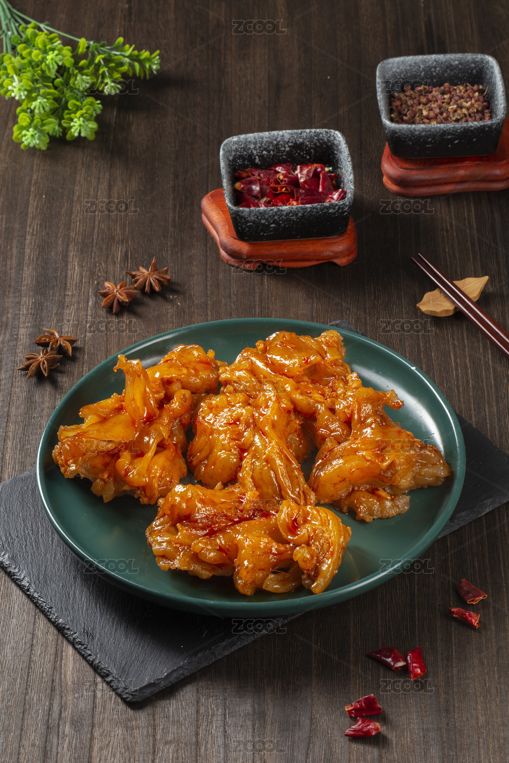 桌面上的盤子里的美味可口的香辣牛蹄筋