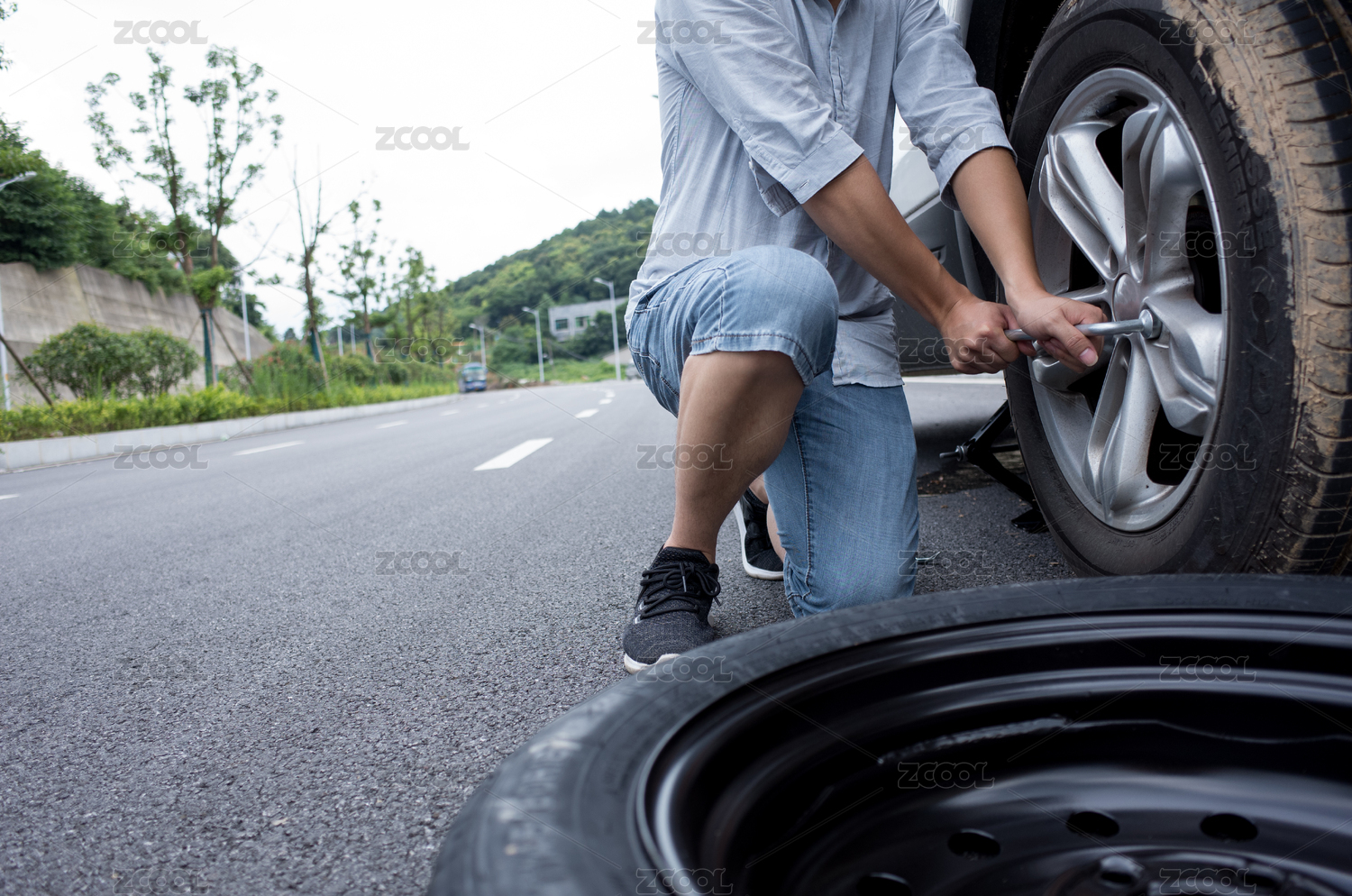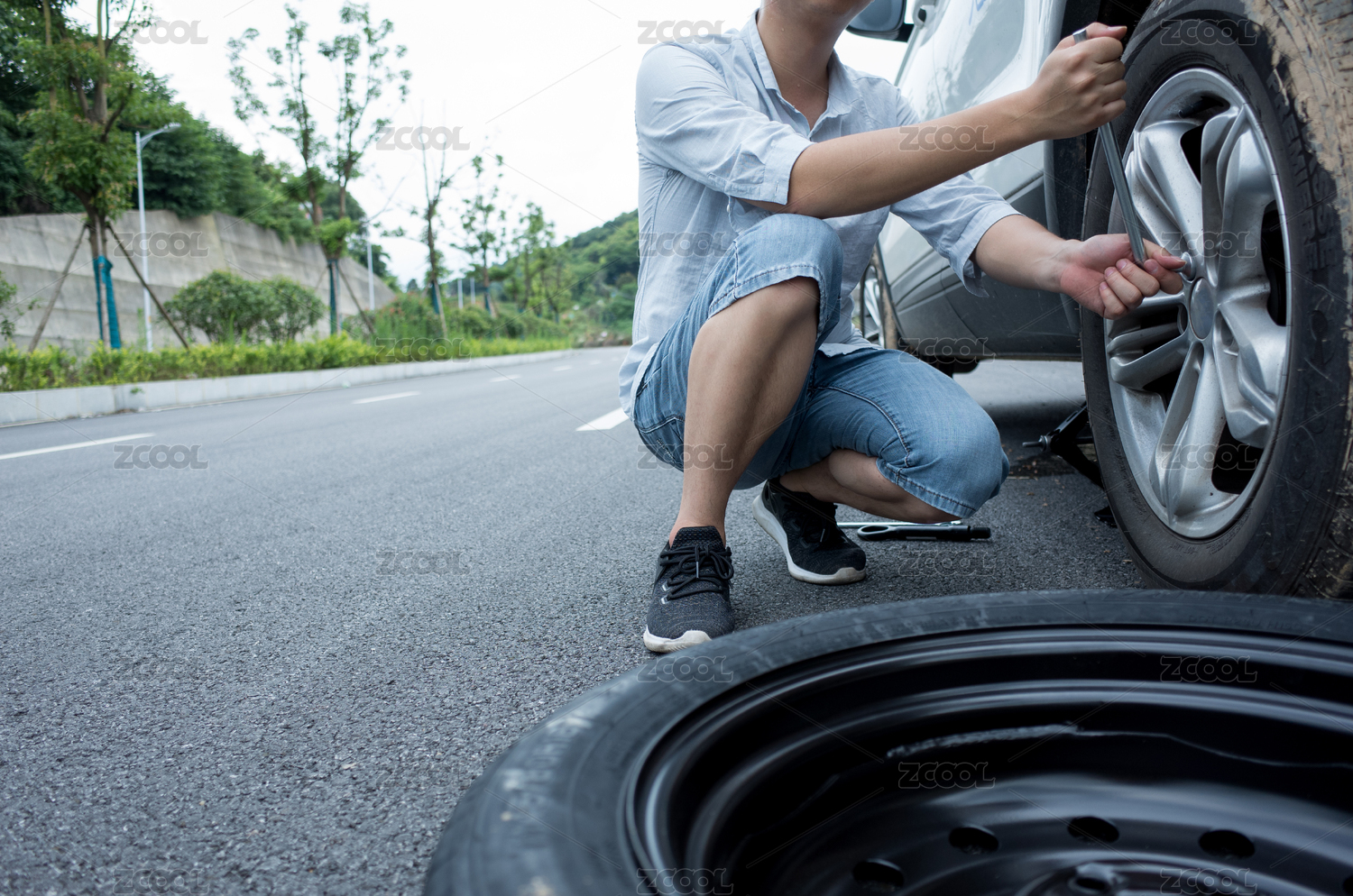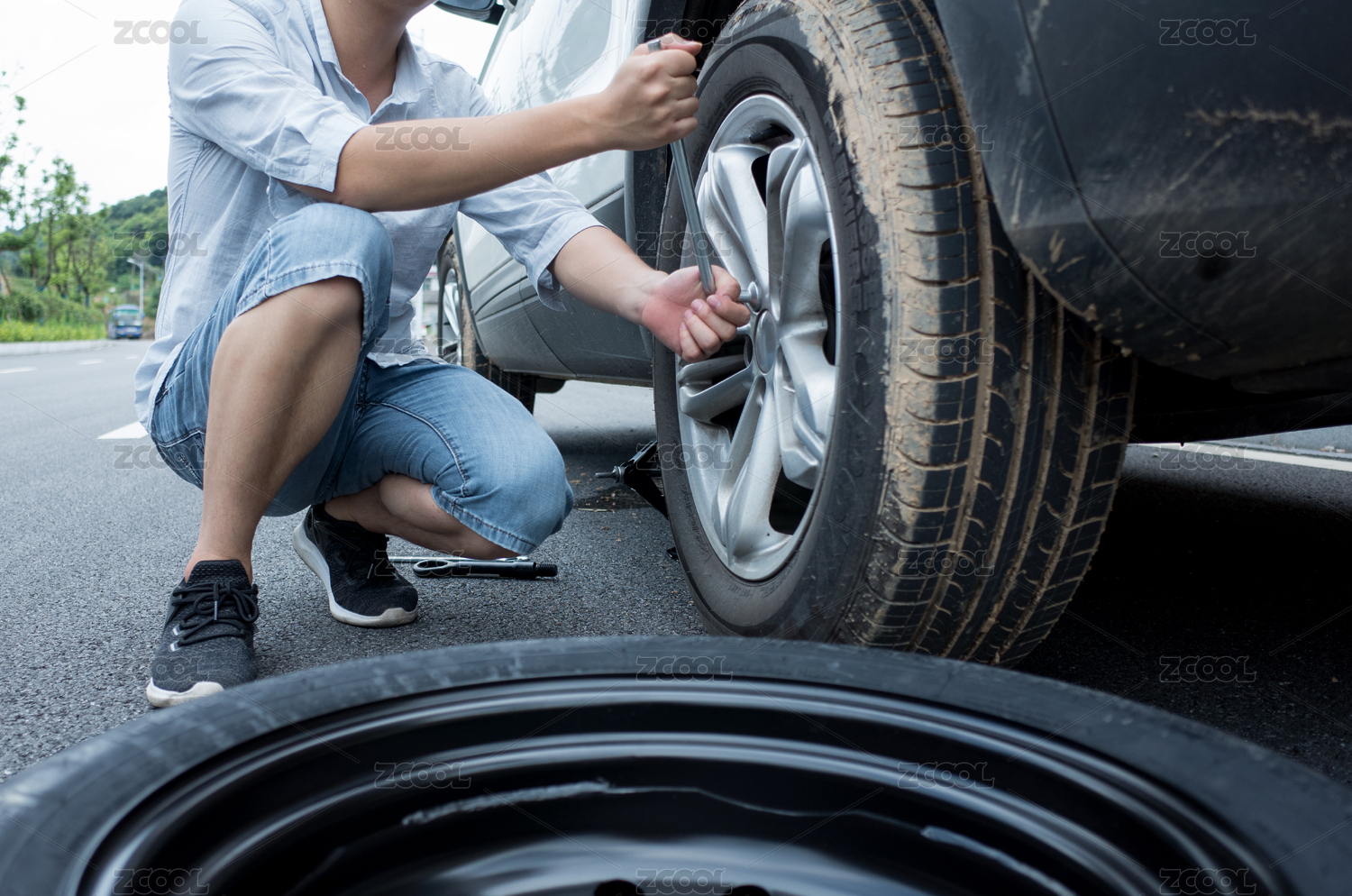 一個(gè)男青年正在給一輛因故障停在路邊的白色小汽車換輪胎