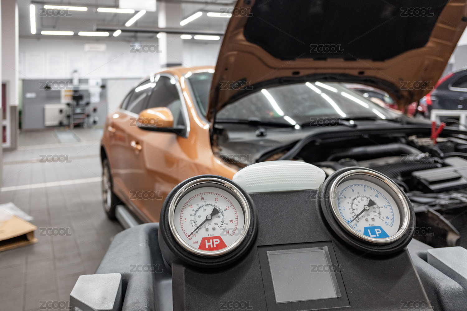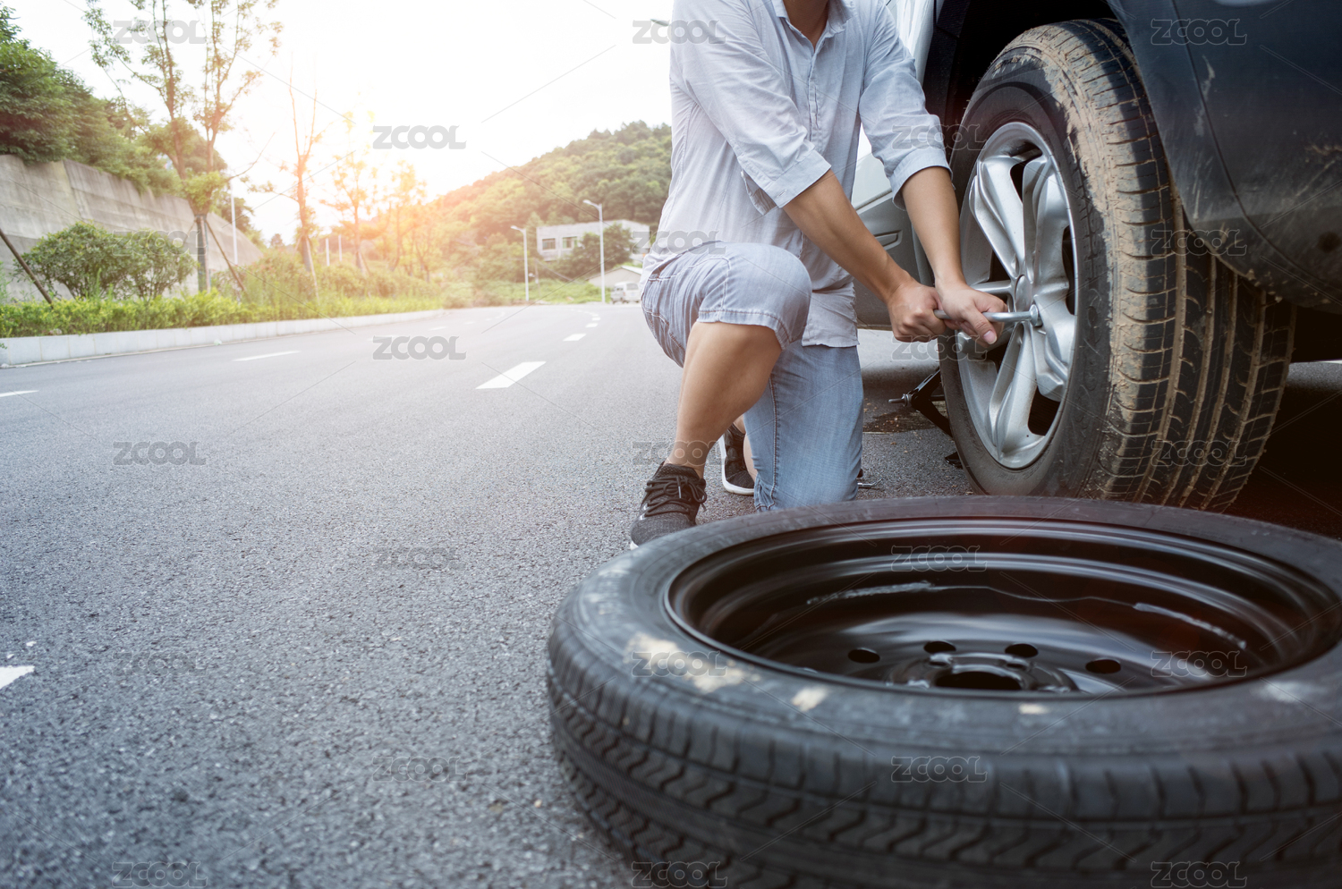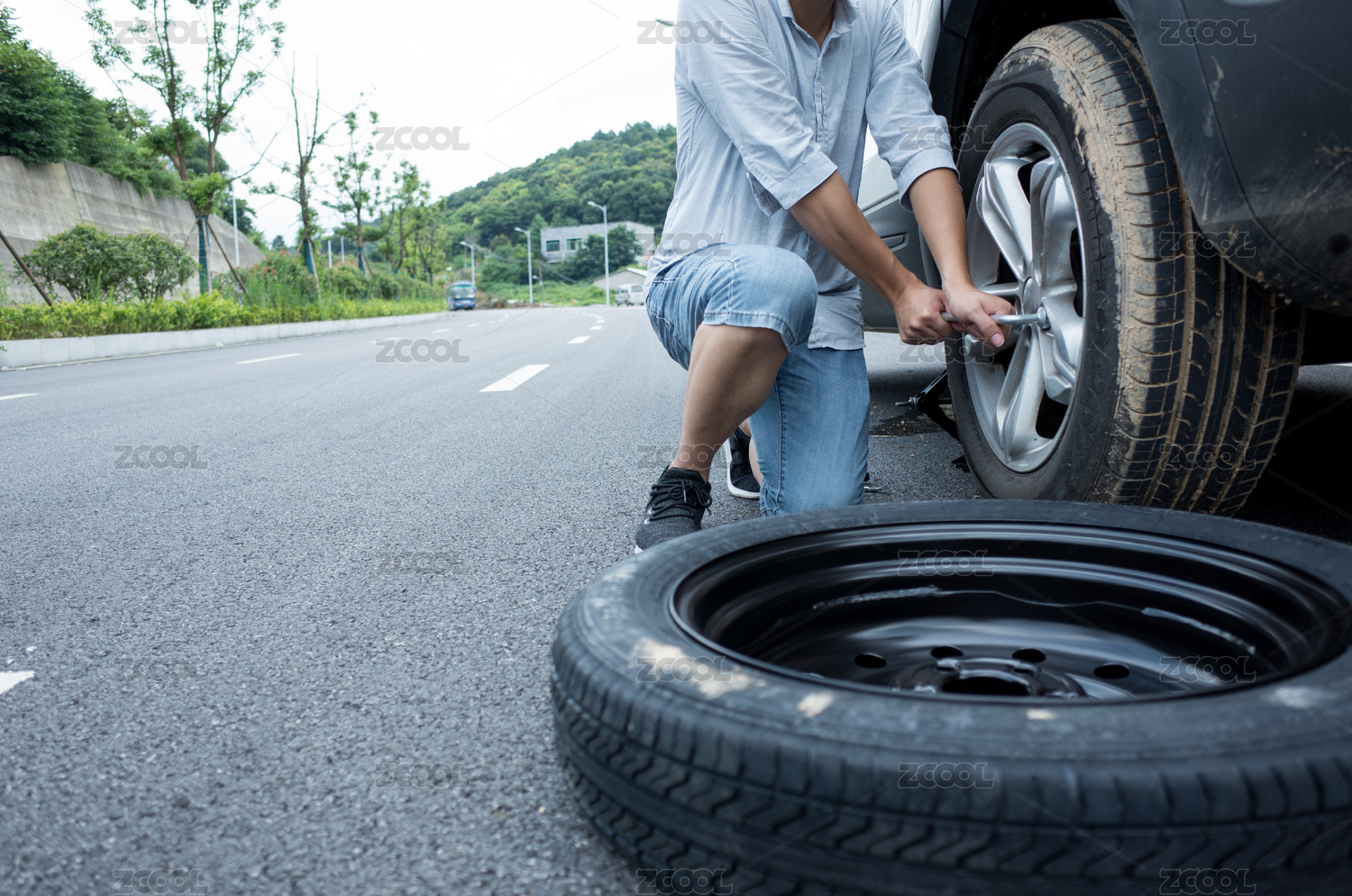 一個(gè)男青年正在給一輛因故障停在路邊的白色小汽車換輪胎
