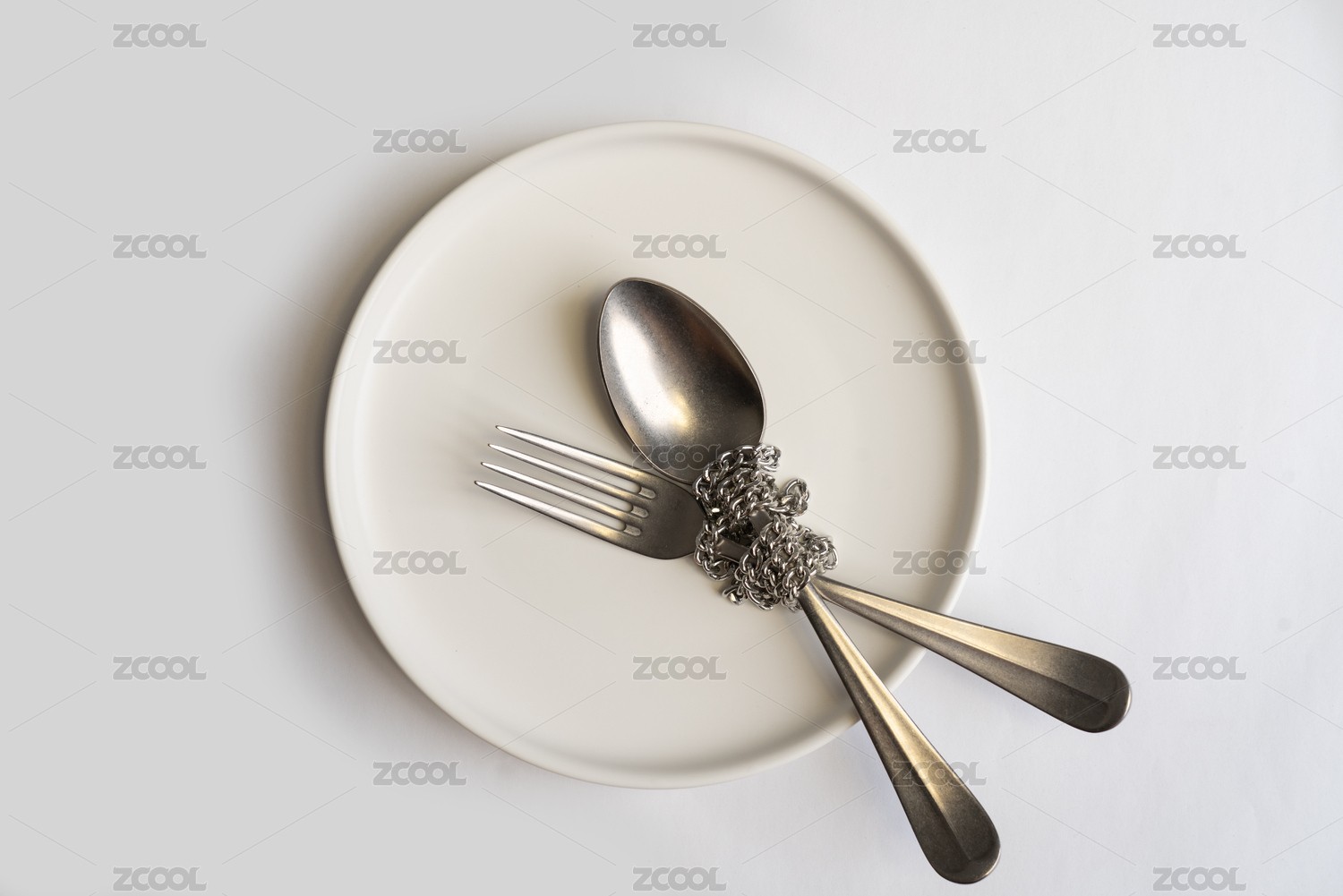 被鏈條捆綁在盤(pán)子中的叉子和勺子微縮創(chuàng)意圖