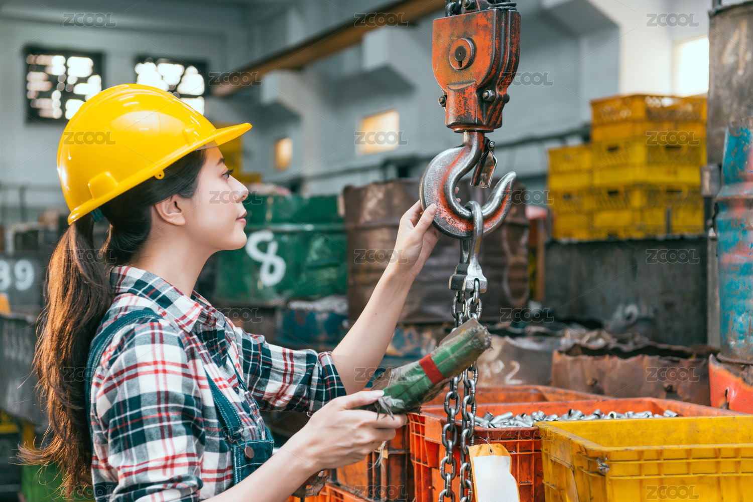 年輕漂亮的銑床廠女工調(diào)整鏈條吊車(chē)準(zhǔn)備加工車(chē)床出貨成品。