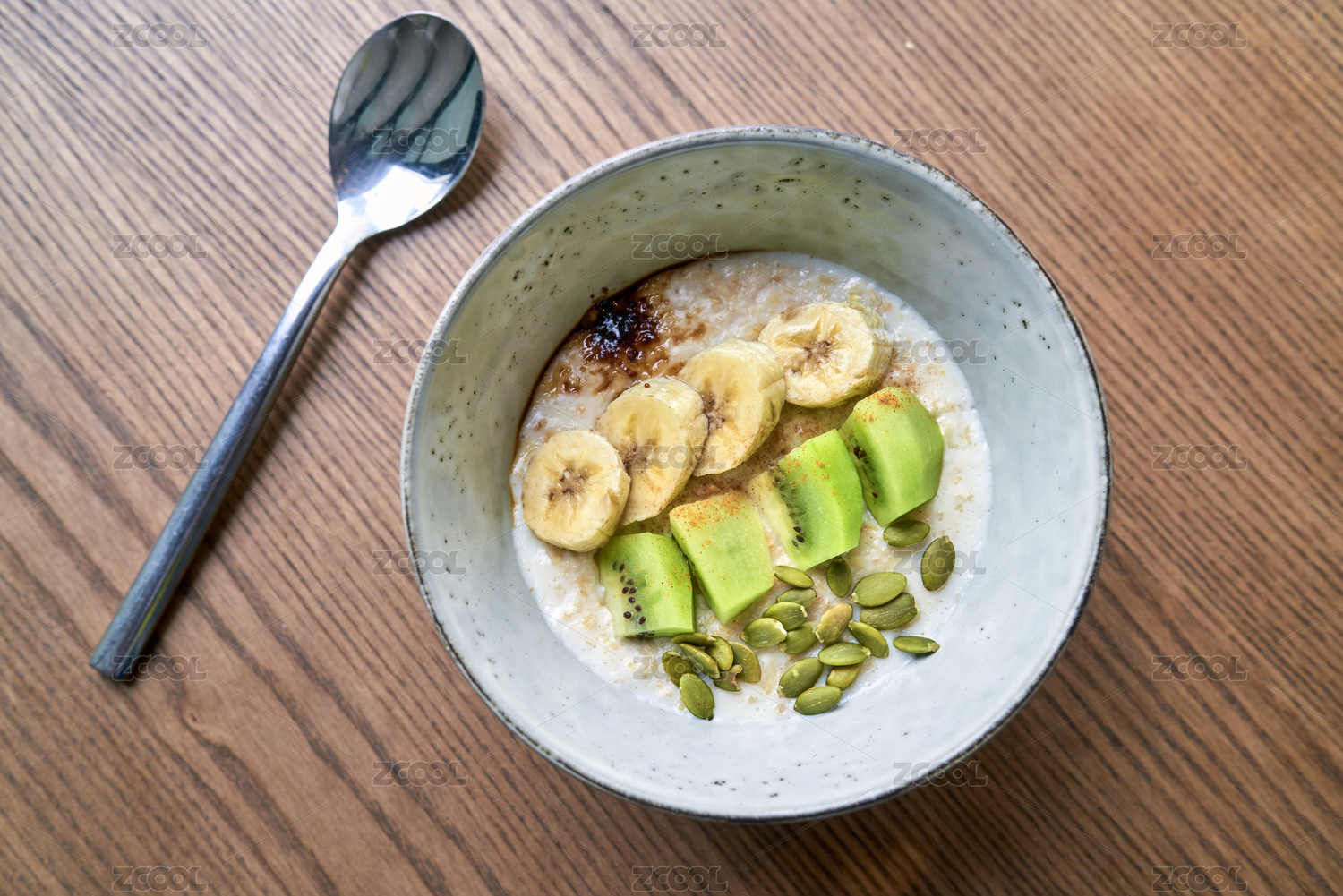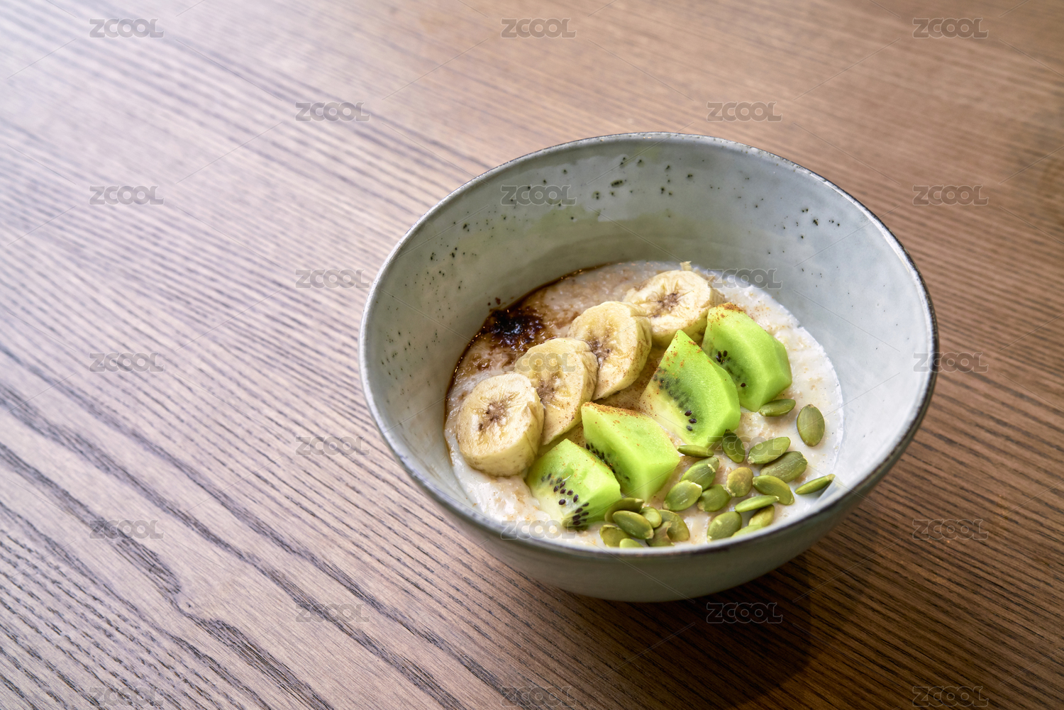 一碗燕麥粥配香蕉、獼猴桃、南瓜子仁和焦糖醬,放在原木色的餐桌上,熱騰騰早餐的健康食品