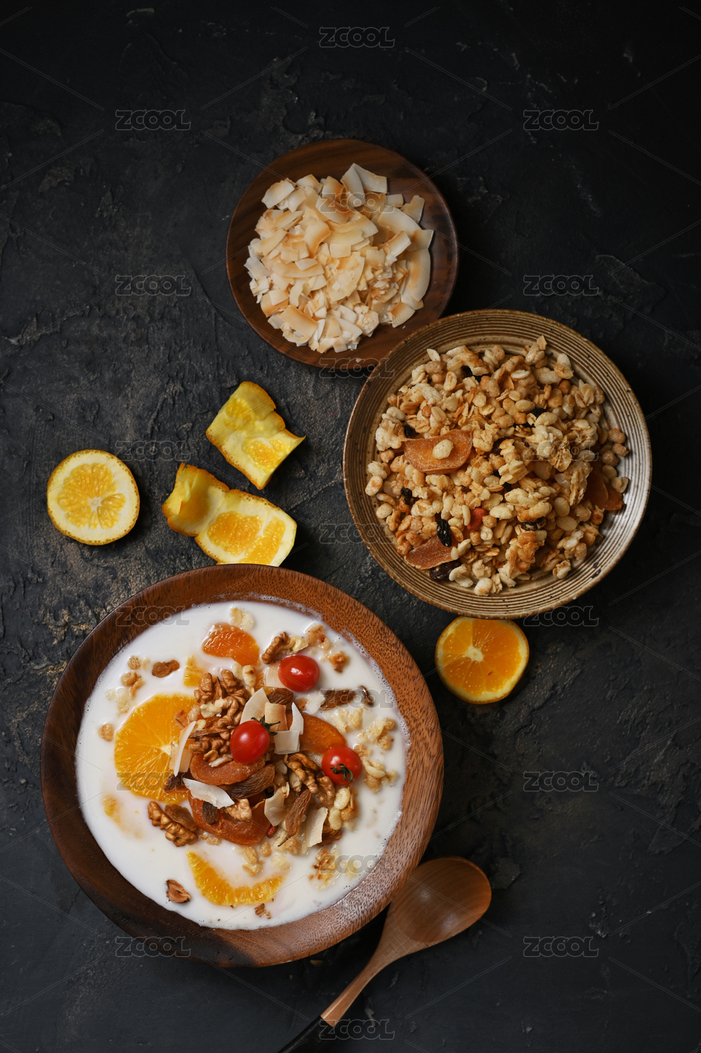 一碗牛奶燕麥粥放在木制底板上