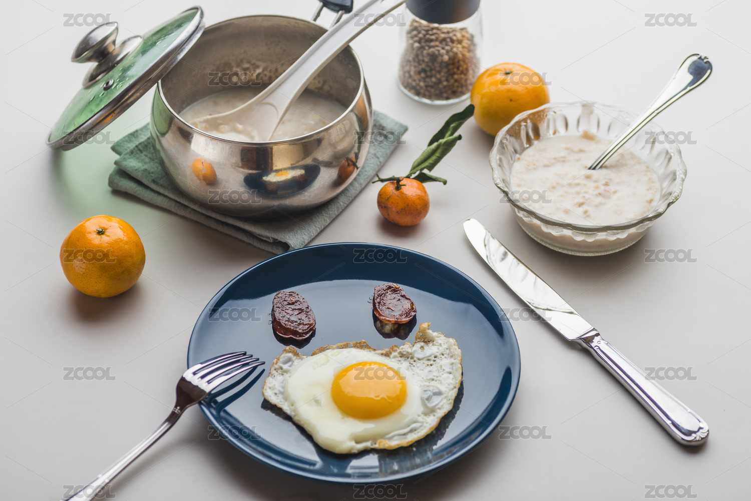 煎雞蛋和牛奶燕麥粥以及水果